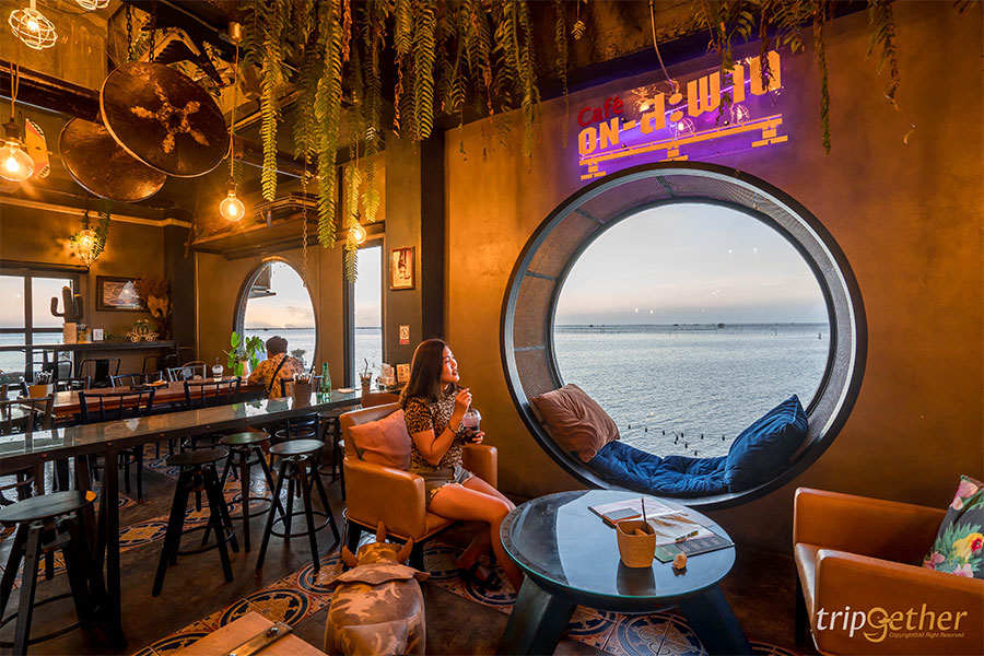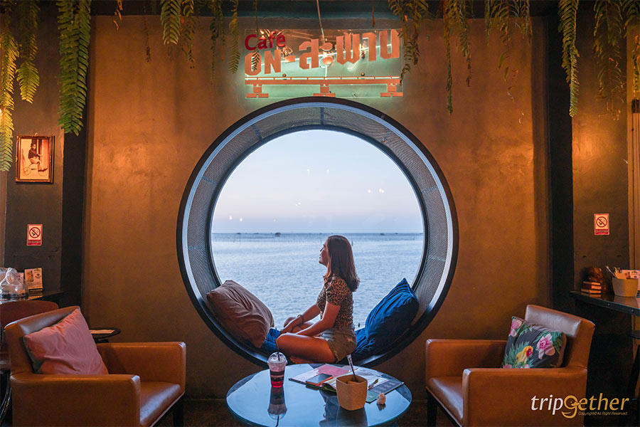 ใครขับรถผ่านไปผ่านมาบนสะพานชลมารควิถี หรือที่หลายคนคุ้นเคยกันในชื่อสะพานเลียบชายทะเล ชลบุรี จะต้องสังเกตเห็น Cafe on สะพาน ที่ตั้งเด่นอยู่อย่างแน่นอน ที่นี่เป็นทั้งคาเฟ่และร้านอาหารที่พร้อมเสิร์ฟทั้งเมนูชา กาแฟ เครื่องดื่มอื่นๆ เบเกอรี่ และเมนูอาหาร อย่างน่องเป็ดเยอรมัน ยำพล่ากุ้ง ข้าวเเซลมอนทอดราดน้ำปลา+ยำมะม่วง หมูทอดน้ำปลาน้ำจิ้มแจ่ว ส้มตำทะเล สลัดทูน่า ข้าวหมูคุโรบูตะเทปันยากิพริกไทยดำ เเหนมปีกไก่ทอด และเเหนมซี่โครงหมูอ่อน นอกจากเมนูอาหารและของหวานที่มากมายให้เลือกแล้ว บรรยากาศร้านยังมีหลากหลายมุมให้เลือกนั่ง ไม่ว่าจะโซนด้านในแอร์เย็นๆ และด้านนอกที่สามารถชมวิวทะเลได้แบบพาโนราม่า ยิ่งช่วงเย็นนในตอนพระอาทิตย์กำลังตกบอกเลยว่าบรรยากาศสวยขึ้นแบบสิบเต็มสิบ