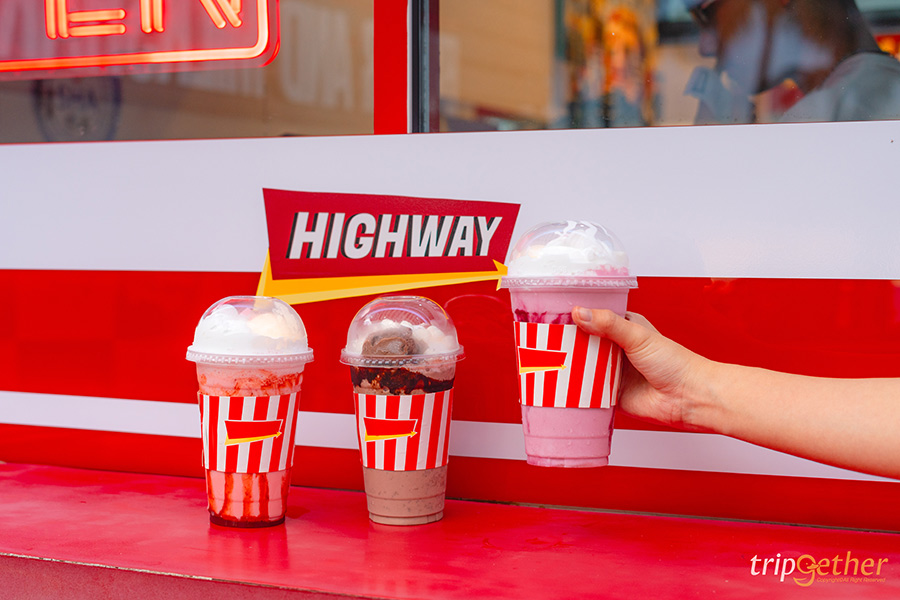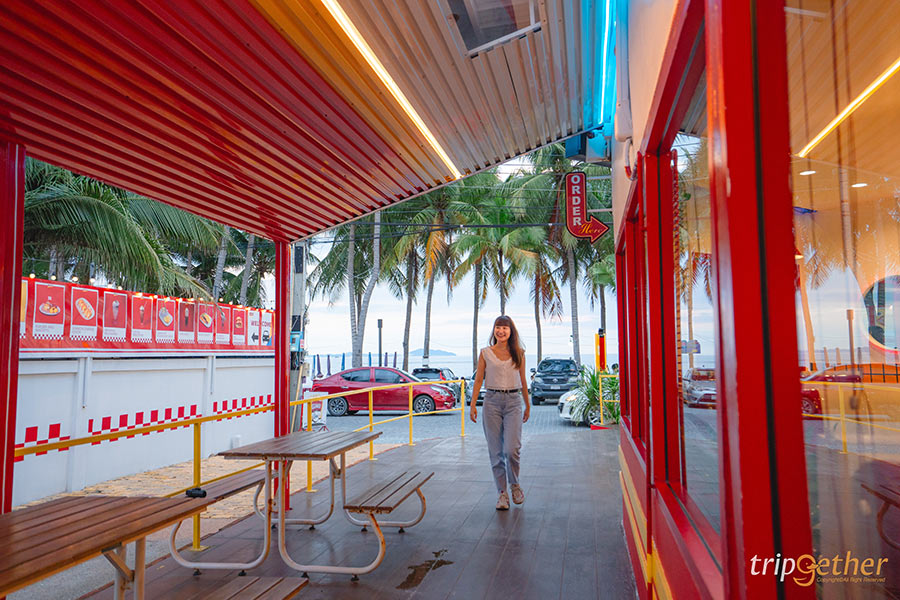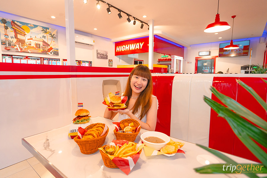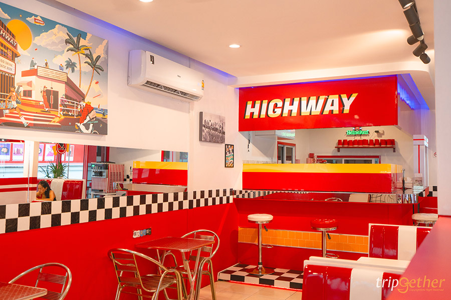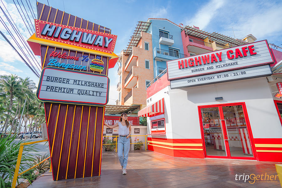 Highway Cafe ร้านอาหารและคาเฟ่บางแสนที่โดดเด่นไม่ซ้ำใครด้วยสไตล์บรรยากาศแบบร้านอาหารบนไฮเวย์ ให้ฟีลเหมือนได้ขับ Road Trip ในอเมริกาแบบสุดๆ ตัวร้านเป็นคาเฟ่ติดทะเล มาพร้อมกับโซนที่นั่ง 3 โซนให้ได้เลือกตามความชอบ ทั้งโซนอินดอร์ที่ต้องบอกเลยว่าเหมือนเป็นวัยรุ่นเมกามาแวะร้านเบอเกอร์มาก เพราะการตกแต่งภายในไม่ว่าจะมองมุมไหน ก็ไม่เหมือนอยู่ไทย หรือใครอยากออกมานั่งดูแสงสวยๆ ฟังเสียงคลื่นก็ต้องจัดโซนเอาท์ดอร์เป็นที่นั่งแบบโต๊ะไม้ มีหลังคาให้พร้อม สำหรับสายชิลล์แนะนำโซนดาดฟ้าที่เห็นวิวชายหาดและทะเลช่วงวานิลลาสกายได้แบบฉ่ำๆ แถมร้านอาหารบางแสนแห่งนี้ไม่ได้ฟีลอเมริกาแค่ตัวร้านนะ แต่อาหารยังมีเมนูเยอะมาก ตอบโจทย์คนที่อยากเปลี่ยนแนวจากอาหารทะเลมาเป็นเบอเกอร์และเมนูอเมริกัน ทั้งเบอเกอร์อร่อยที่เป็นโฮมเมดเบอเกอร์สูตรของทางร้านที่นี่ที่เดียว อย่างเลิฟบีฟ เมนูขายดีที่เป็นเบอเกอร์เนื้อชีสซอฟทรัฟเฟิล ซึ่งใช้เนื้อไทยวากิว ในส่วนของตัวแป้งยังเป็นสูตรเฉพาะของทางร้าน นอกจากนี้ยังมีขนมปังเนย โทสต์ไข่ดาว ซุปเห็ด และยังเมนูเครื่องดื่มอย่างมิลค์เชค สตรอเบอรี่มิลค์เชค ที่เป็นสตรอเบอรี่ปั่นกับนมและไอศกรีม แถมยังมีซอฟต์ไอศกรีม รวมทั้งเมนูอื่นๆ ให้เลือกสั่งอีกเพียบ เอาเป็นว่าสายคอนเทนต์คนไหนที่กำลังมองหาร้านอาหารและคาเฟ่บางแสนแบบไม่ซ้ำใคร ให้ได้นั่งกินอาหารเช้าติดทะเลสบายๆ ใช้เวลาพักผ่อนแบบวัยรุ่น Y2K แถมยังมีที่จอดรถเยอะ ขอแนะนำที่ Highway Cafe เลย