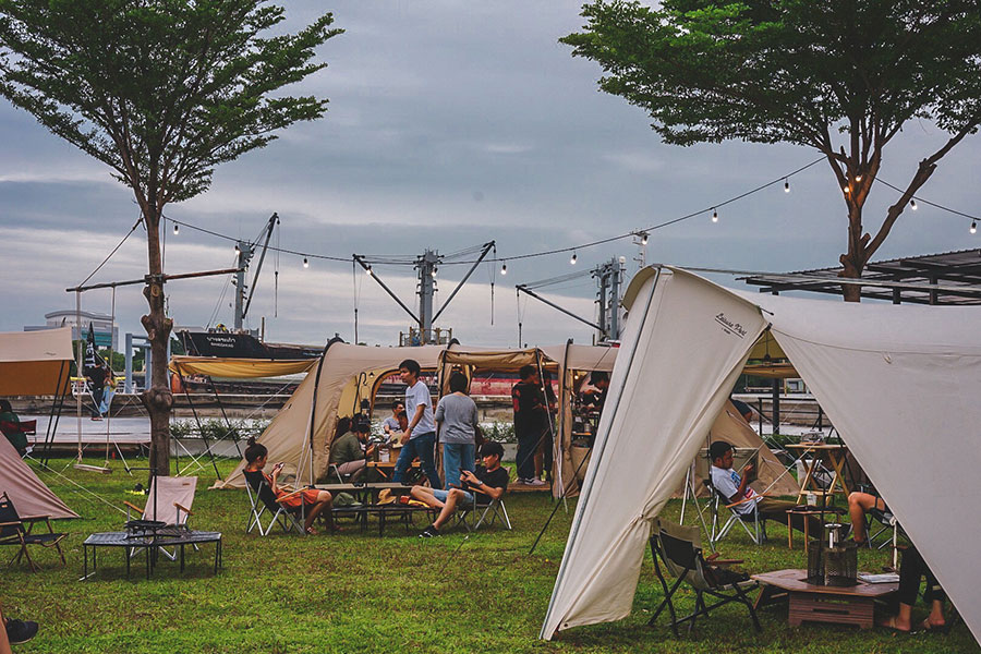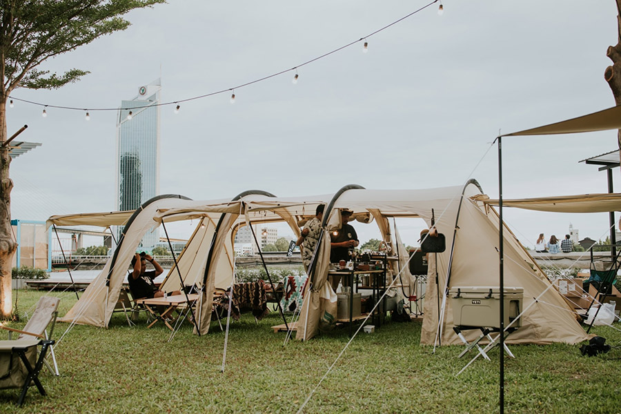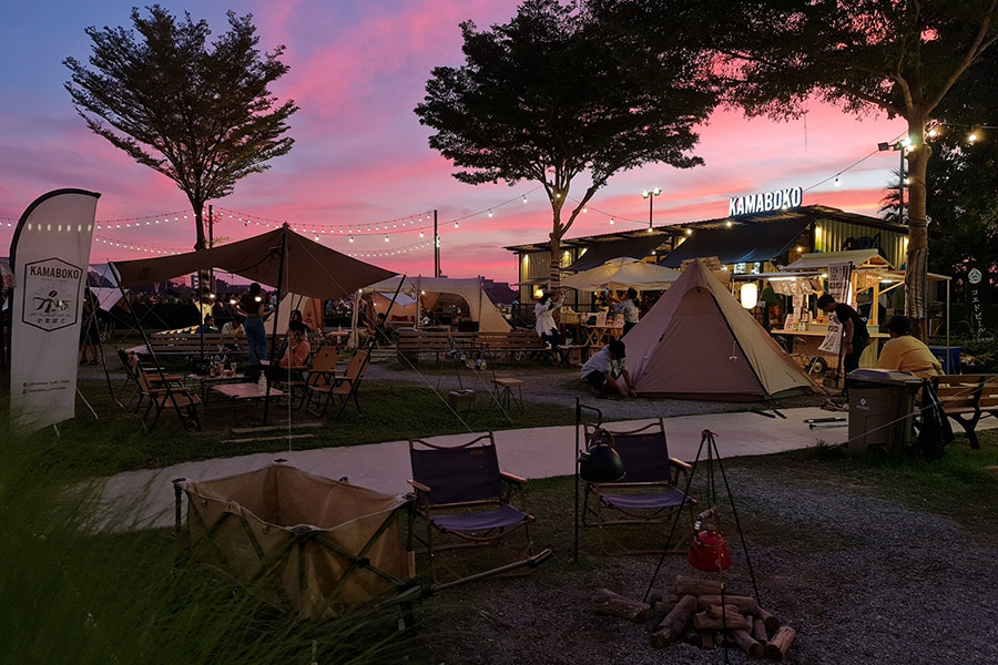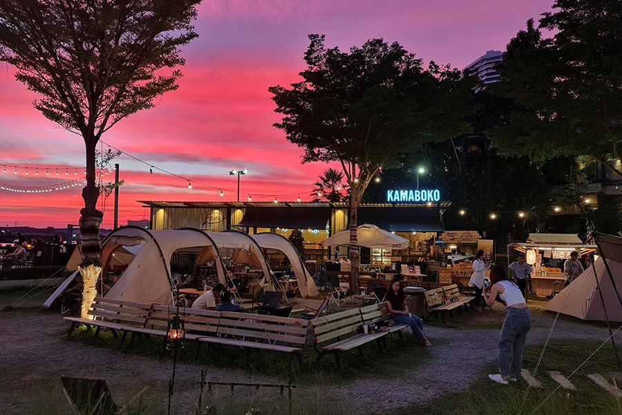 Kamaboko coffee camp คาเฟ่สไตล์แคมป์ญี่ปุ่นตั้งอยู่ในพื้นที่เดียวกับ MF Riverfront พระราม 3 โดยที่นี่เลือกใช้เต็นท์แบรนด์ DOD จากประเทศญี่ปุ่น ซึ่งเป็นที่มาของชื่อ Kamaboko เพราะอยากจำลองการตั้งแคมป์แบบญี่ปุ่น ตัวคาเฟ่เน้นบรรยากาศแบบเอ้าท์ดอร์ติดริมแม่น้ำเจ้าพระยาบอกเลยว่าชิคมาก ด้วยการตกแต่งน่ารักๆ ตั้งเต็นท์เรียงรายบนสนามหญ้า มีเก้าอี้สนาม ด้วยการตกแต่งที่น่ารักให้ฟีลเหมือนตั้งแคมป์นั่งจิบกาแฟริมน้ำสโลว์ไลฟ์มากๆ คอกาแฟที่อยากนั่งชิลล์บรรยากาศสบายๆ ต้องแวะมาให้ได้เลย