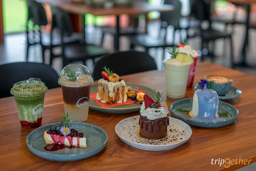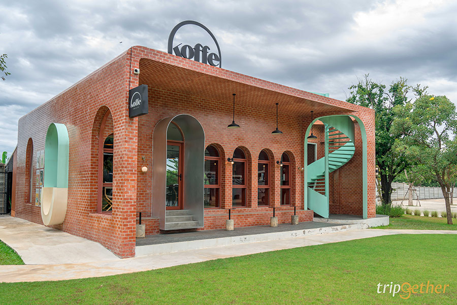 Koffe.Coffeebar คาเฟ่เปิดใหม่จังหวัดกาญจนบุรี ที่โดดเด่นด้วยตัวอาคารที่ใช้อิฐเผาสีส้ม ตกแต่งสไตล์กึ่งโมเดิร์นอังกฤษ ดีไซน์หน้าต่างให้มีความโค้งสอดรับไปกับตัวอาคารพร้อมกับติดกระจกใสบานสูงที่ทำให้ภายในร้านดูโปร่งให้ความรู้สึกอบอุ่น และไฮไลท์ของร้านที่ใครมาก็ต้องถ่ายรูปเช็คอินกันคือบันไดวนสีเขียวมินท์ตัดกับสีส้มอิฐของตัวอาคาร บอกเลยว่ามุมนี้ห้ามพลาด เมนูอาหารของร้านก็อร่อยไม่แพ้ใคร เมนูที่แนะนำเลยข้าวผัดกระเทียม เนื้อย่าง ไข่ดอง ข้าวที่ผัดกับกระเทียมจนหอมกินกับเนื้อย่างนุ่มๆ พร้อมกับไข่ดอง หรือ All day brunch อาหารสไตล์อเมริกันที่จัดเซ็ตมาแบบแน่นๆ ผัดไทยกุ้ง ที่เส้นผัดไทยเหนียวนุ่มพร้อมกับกุ้งตัวโตๆ สปาเก็ตตี้คาโบนาร่าไข่ออนเซ็นใครที่ชอบอาหารสไตล์อิตาเลี่ยนบอกเลยว่าติดใจแน่นอน ส่วนเบเกอรี่ขอแนะนำเมนูซิกเนเจอร์อย่าง Bake a cube แป้งครัวซองต์คิวบ์สอดไส้ชาไทย กรอบนอก กินคู่กับชาโคลครัมเบิลกรุบกรอบ ท็อปด้วยครีมชีสละมุนสุดๆ นอกจากนี้ยังมีเมนู Chocolate ganache และเค้กมะพร้าวอัญชันแสนอร่อยที่ต้องมาชิมกันให้ได้เลย และเครื่องดื่มก็มีทั้ง Koffe, Latte art, Strawberry fresh milk frappe, Matcha strawberry และน้ำผลไม้สกัดเย็น บอกเลยว่าอิ่มอร่อยทุกเมนูแน่นอน