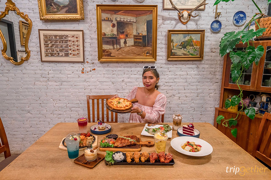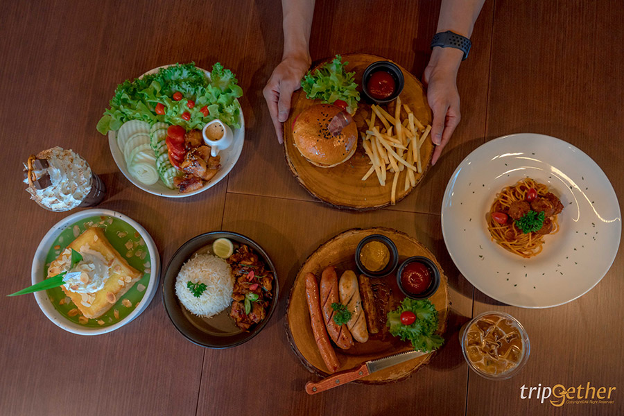 ราวี รีวา คาเฟ่ คาเฟ่กาญจนบุรี บรรยากาศอบอุ่นสไตล์วินเทจที่อยู่ท่ามกลางสวนสไตล์อังกฤษแสนร่มรื่น ตัวร้านแบ่งออกเป็น 2 โซนคือโซนคาเฟ่และโซนริมน้ำ สามารถนั่งได้ทั้งอินดอร์และเอาท์ดอร์ ภายในร้านตกแต่งด้วยดอกไม้แห้งและเฟอร์นิเจอร์แบบวินเทจทำให้ร้านดูคลาสสิกและมีเสน่ห์สุดๆ รอบๆ ตัวร้านยังมีมุมนั่งเล่นพักผ่อนอีกมากมาย ไม่ว่าจะเดินไปมุมไหนก็สามารถถ่ายรูปเช็คอินสวยๆ ได้อีกด้วย ส่วนเมนูของร้านก็มีให้เลือกมากมายไม่ว่าจะเป็นเมนูไส้กรอกรวม 7 ชนิด แมงกะพรุนผัดน้ำมันงาที่มาคู่กับน้ำจิ้มซีฟู้ดรสแซ่บ ไก่ทอดราวี รีวา ไก่ทอดสไตล์เกาหลีที่แนะนำว่าต้องลอง ซี่โครงหมูอบบาบีคิวเนื้อนุ่มและหอมกลิ่นบาบีคิวสุดๆ สปาเก็ตตี้เขียวหวานทะเลรสชาติเข้มข้นถึงเครื่องแกงที่เข้ากันอย่างลงตัวเมื่อกินกับเส้นสปาเก็ตตี้ พิซซ่าฮาวายเอี้ยนแป้งหนาชีสยืดหน้าแน่นๆ และปลากะพงนึ่งมะนาวรสชาติจัดจ้าน เครื่องดื่ม และเบเกอรี่ ขอบอกเลยว่าอร่อยทุกเมนูจริงๆ ส่วนเครื่องดื่มก็มีทั้ง ซินนาม่อนลาเต้ My Valentine อัฟโฟกาโต้ มัลดีฟส์ เสาวรสโยเกิร์ตสมูทตี้ และเอาใจสายหวานด้วยเมนูเบเกอรี่อร่อยๆ อย่างบานอฟฟี่และเค้กเรดเวลเวท คาเฟ่สวย บรรยากาศดี อาหารอร่อยแบบนี้สายเช็คอินจะพลาดกันได้ไง