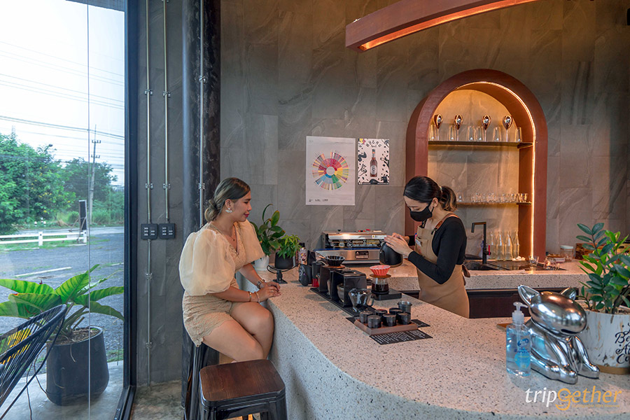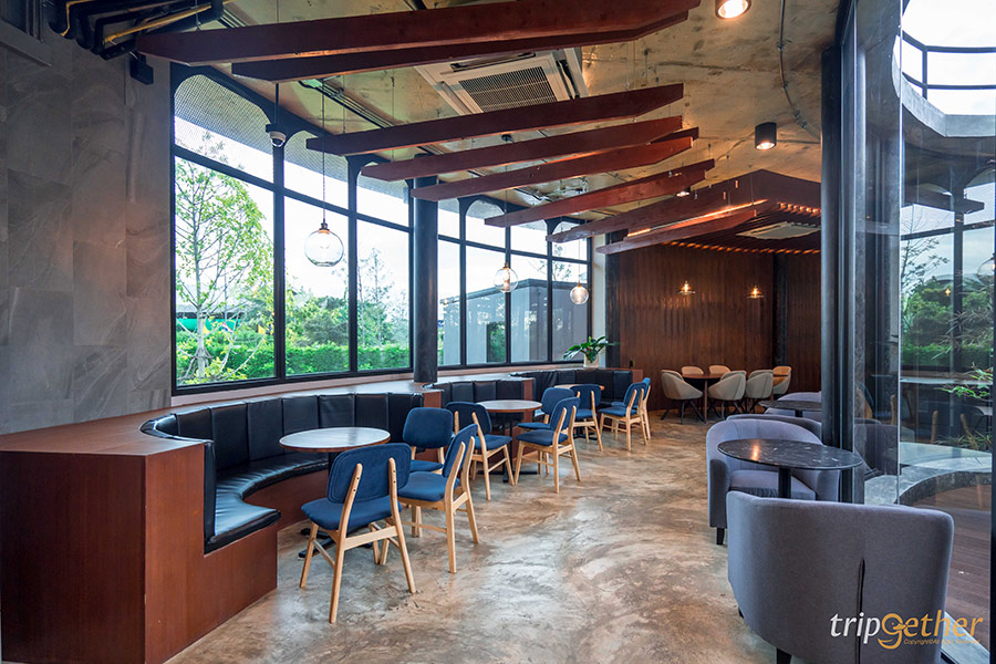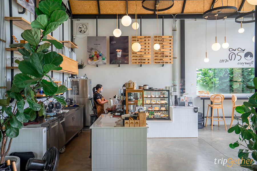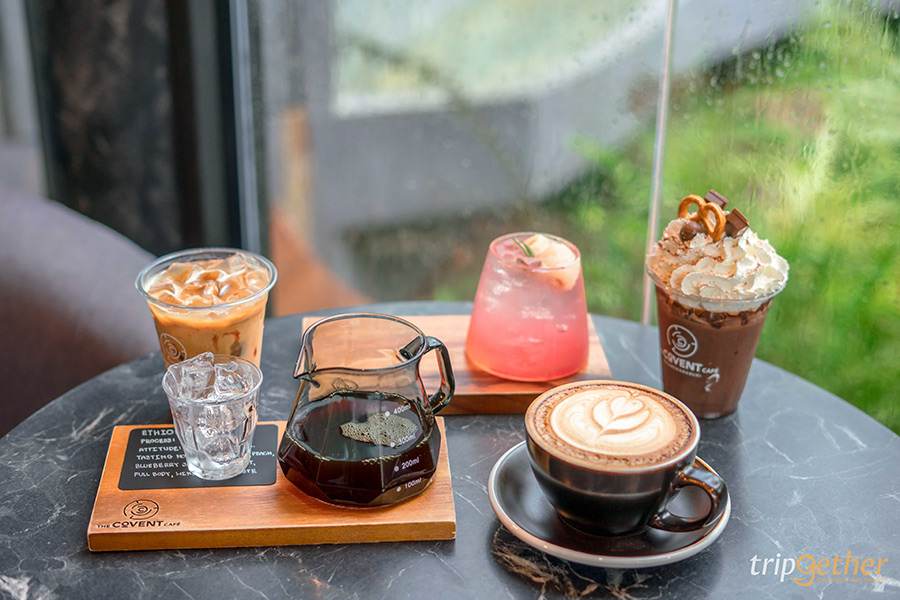 The Covent Cafe Kanchanaburi คาเฟ่กาญจนบุรีดีไซน์สวยแปลกตาที่มาในรูปทรงอาคารที่เป็นวงกลม มีความเป็นลอฟท์ผสมกับความเป็นโมเดิร์นได้อย่างลงตัว และผนังของร้านเป็นกระจกบานใสใหญ่ที่สามารถมองเห็นวิวสวยๆ ด้านนอกได้อีกด้วย โซนนั่งของร้านจะแบ่งเป็นโซนอินดอร์และเอาท์ดอร์ และมีโซนห้องประชุมที่อยู่ในตัวอาคารอีกด้านหนึ่ง ด้านนอกมีบันไดสำหรับเดินขึ้นไปยังดาดฟ้าเป็นมุมถ่ายรูปสวยๆ หรือจะขึ้นไปชมวิวก็สามารถมองเห็นวิวโดยรอบได้แบบ 360 องศากันไปเลย นอกจากความสวยของร้านและมุมถ่ายรูปเก๋ๆ แล้ว อาหารและเครื่องดื่มของร้านนี้ก็อร่อยจนต้องยกนิ้วให้ ยิ่งเป็นคอกาแฟด้วยแล้วจะต้องตกหลุมรักอย่างแน่นอน เพราะเมล็ดกาแฟของที่นี่มีให้เลือกหลากหลาย ใครเป็นสายดริปขอแนะนำเมนู Ethiopia ส่วนใครอยากกินกาแฟแบบสดชื่นๆ ก็ต้องลอง Black Pink ตามด้วยเมนูของคนรักขนมกับเมนูโชกุปังสังขยาใบเตย และที่ห้ามพลาดเลยคือ The Covent Burger เมนูเบอร์เกอร์ที่เป็นสูตรของทางร้าน ใครที่เป็นมังสวิรัติที่นี่ก็มีเมนูสำหรับมังสวิรัติด้วยเช่นกัน
