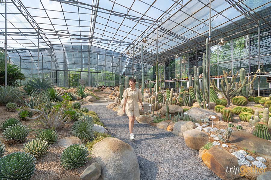 เอาใจคนรักต้นไม้กันต่อที่ Botanist Activity Space & Cafe คาเฟ่มีนบุรีน้องใหม่ที่โอบล้อมไปด้วยความกรีนของธรรมชาติ ตัวร้านมีพื้นที่ทั้งหมด 5 ไร่ แบ่งออกเป็นส่วนคาเฟ่และสวน ซึ่งสวนของทางร้านมี 5 โซนก็คือ ร้อนชื้น ดิบชื้น ป่าปรง สับปะรดสี และทะเลทราย และไฮไลท์ที่ใครมาต้องเช็คอินคือโซนทะเลทรายที่มีต้นกระบองเพชรน้อยใหญ่จำนวนมาก ซึ่งโซนนี้ก็เป็นที่ตั้งของร้านคาเฟ่ โดยตัวคาเฟ่เป็นอาคาร 2 ชั้นแบบกลาสเฮ้าส์ที่มีกระจกใสอยู่รอบร้าน ทำให้สามารถมองเห็นความงามของพื้นที่โซนทะเลทรายได้แบบ 180 องศา อีกทั้งยังช่วยให้แสงส่องเข้ามาในร้าน ช่วยให้ร้านดูโล่งโปร่งและสบายตา สำหรับเมนูส่วนใหญ่จะเป็นของหวานและเครื่องดื่มที่มีส่วนผสมหลักเป็นมัทฉะ เรียกได้ว่าใครชอบชาเขียวจะต้องเลิฟมากๆ เพราะว่าเมนูชาเขียวทางร้านครีเอทและแปลกใหม่มากๆ สั่งมานั่งจิบชิลล์ๆ ในร้านที่เป็นห้องแอร์เย็นๆ หรืออยากดื่มด่ำธรรมชาติก็สามารถยกไปนั่งกินที่เอาท์ดอร์ได้เลย บอกเลยว่าเป็นคาเฟ่ที่เหมาะกับการมาเสพธรรมชาติชิลล์ๆ และใช้เวลาในวันหยุดแบบสโลว์ไลฟ์มาก