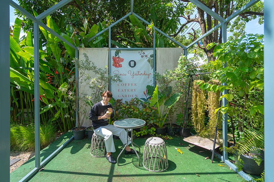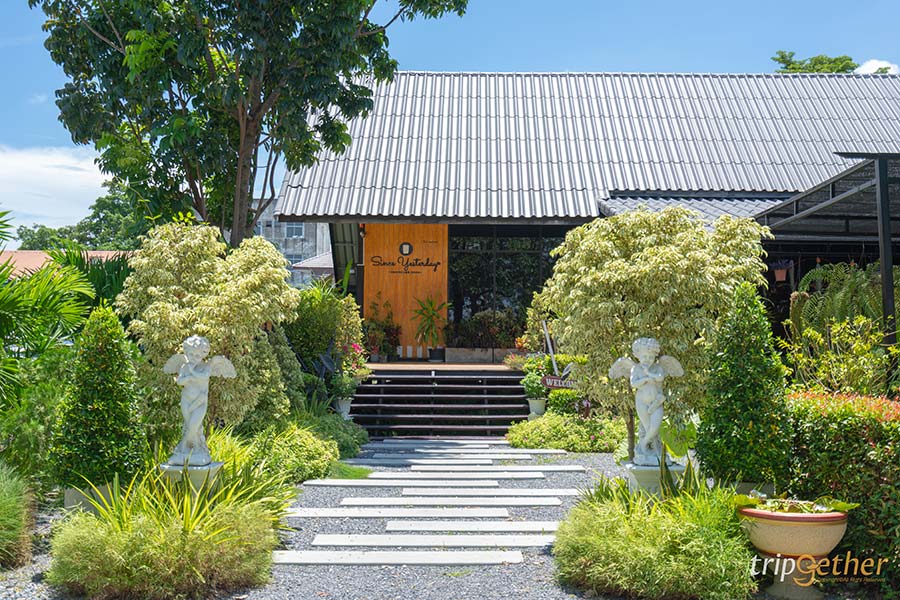 Since Yesterday Cafe คาเฟ่มีนบุรี มาในสไตล์เรือนกระจกล้อมรอบด้วยบรรดาต้นไม้น้อยใหญ่สุดกรีน เฟอร์นิเจอร์ในร้านตกแต่งโทนสีดำตัดกับเฟอร์นิเจอร์ไม้ ให้ความรู้สึกคลาสสิกเล็กๆ ที่นี่มีโซนที่นั่งทั้งอินดอร์และเอาท์ดอร์ โซนอินดอร์จะเป็นที่นั่งภายในเรือนกระจก ถึงจะเป็นด้านในแต่บรรยากาศก็ปลอดโปร่งโล่งสบายมาก นั่งชมวิวสวนผ่านกระจกบานใหญ่ได้แบบชิลล์ๆ ส่วนใครอยากได้ฟีลนั่งท่ามกลางธรรมชาติก็เลือกเป็นโซนเอาท์ดอร์เลย นั่งชมต้นไม้ในสวนแบบเพลินๆ หรือจะหามุมเด็ดๆ ถ่ายรูปก็ได้ รับรองว่าดูไม่ออกแน่นอนว่าอยู่ในกรุงเทพฯ ส่วนเมนูที่เสิร์ฟก็มีทั้งอาหารคาว ของหวาน และเครื่องดื่ม เรียกได้ว่าจบมื้อได้ในที่เดียว แวะมาเช็คอินกันได้เลย