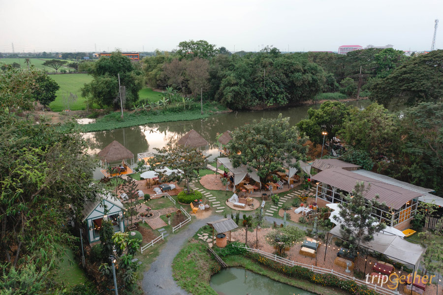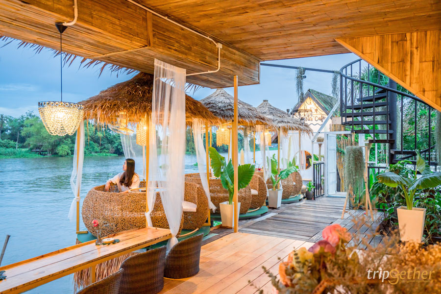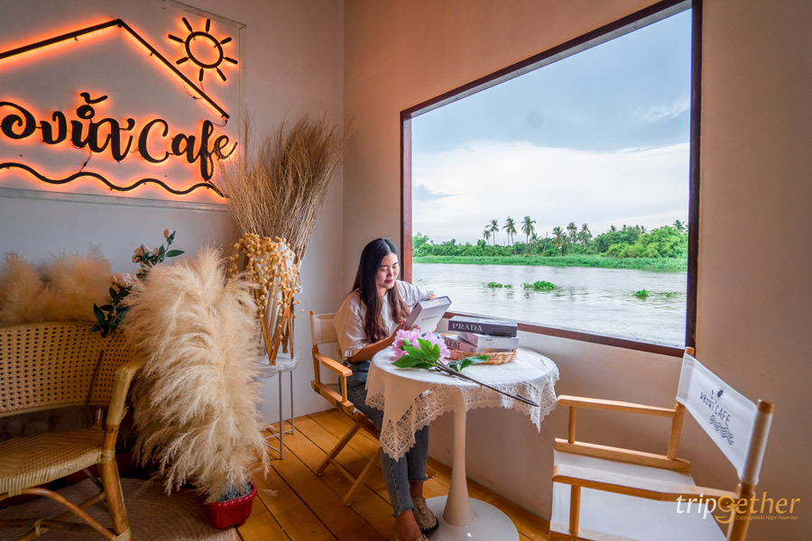 มองน้ำ คาเฟ่ คาเฟ่สวยใกล้กรุงเทพฯ อีกหนึ่งที่ ตั้งอยู่อำเภอนครชัยศรี จังหวัดนครปฐม เป็นคาเฟ่ริมแม่น้ำท่าจีน ที่ต้องนั่งเรือไปยังคาเฟ่เท่านั้น บอกเลยว่าแค่เริ่มต้นก็ได้รูปเก๋ๆ บนเรือมาเพียบแล้ว ส่วนตัวคาเฟ่ก็บอกเลยว่าสวยมาก มีมุมถ่ายรูปเยอะเต็มไปหมด เริ่มจากการตกแต่งของร้านที่เน้นใช้วัสดุธรรมชาติอย่างไม้ไผ่และหญ้าแฝก ประดับตกแต่งด้วยดอกเลาสีขาวเทาปุกปุยน่ารัก ให้ความรู้สึกเหมือนอยู่ในนิทานสักเรื่อง ส่วนมุมถ่ายรูปที่ห้ามพลาดคือ มุมเก้าอี้ข้างหน้าต่างบานใหญ่ มองออกไปเห็นวิวแม่น้ำ บอกเลยว่าปังสุด หรือใครชอบแสงกลางคืนก็แนะนำเป็นที่นั่งซุ้มรังนกริมน้ำ ตอนกลางคืนจะมีไฟสีทอง ถ่ายรูปออกมาสวยมาก ให้ฟีลเหมือนนั่งอยู่กลางน้ำสุด