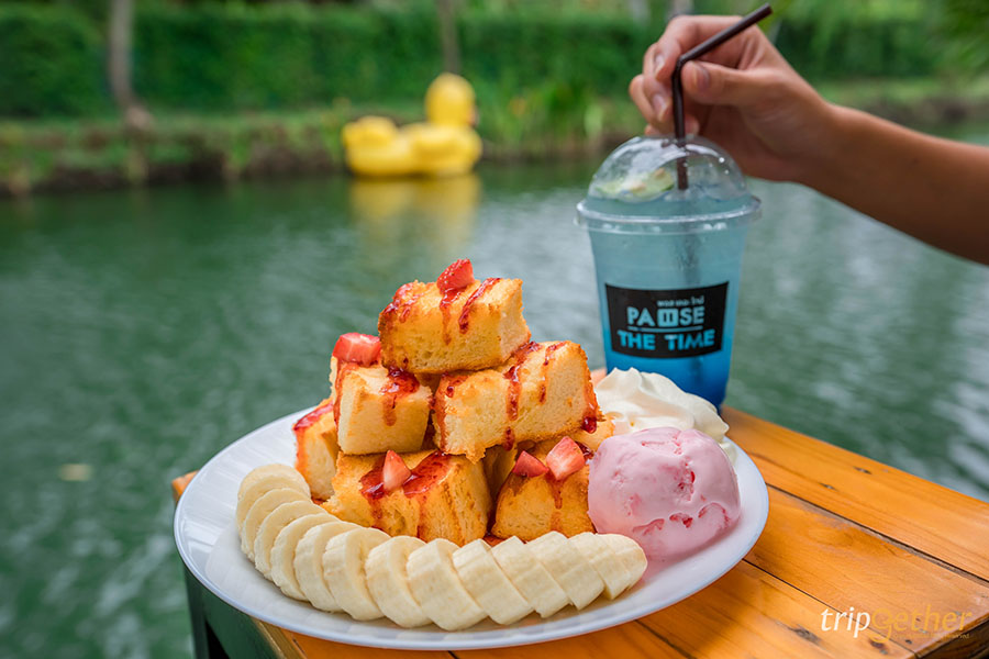 พอส เดอะไทม์ คาเฟ่บรรยากาศริมน้ำ ที่จะพาทุกคนไปดื่มด่ำกับการพักผ่อนและรับประทานอาหาร ภายในร้านมีหลากหลายโซนให้เลือกนั่ง ทั้งโซนอินดอร์ในห้องแอร์ โซนเอ้าท์ดอร์เทอเรสริมสระน้ำ และโซนซุ้มริมสระน้ำ แวดล้อมไปด้วยต้นไม่และสายน้ำสุดชุ่มฉ่ำ ด้านอาหารของที่ร้านเป็นสไตล์ฟิวชั่น และอาหารไทย เมนูเด็ดแนะนำของที่นี่คือ สเต็กหมู สปาเก็ตตี้ผัดขี้เมาทะเล ตำไหลบัวกุ้งสด ตำคอหมูย่าง สำหรับของหวานเป็นสตอรว์เบอร์รี่โทสต์ ชาเขียว และโกโก้ เรียกว่ามาครบ จะมื้อหลักหรือมื้อรองก็สามารถมาใช้บริการได้