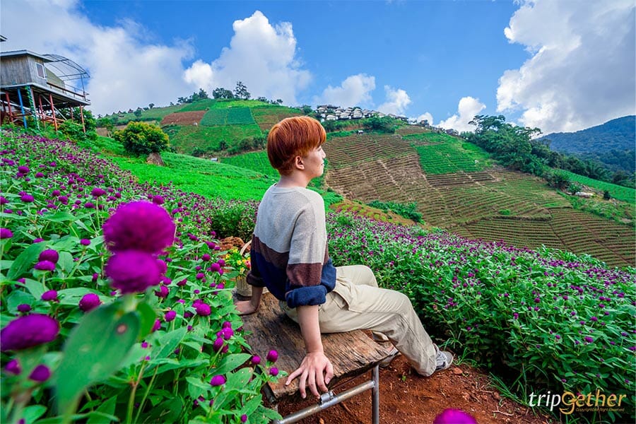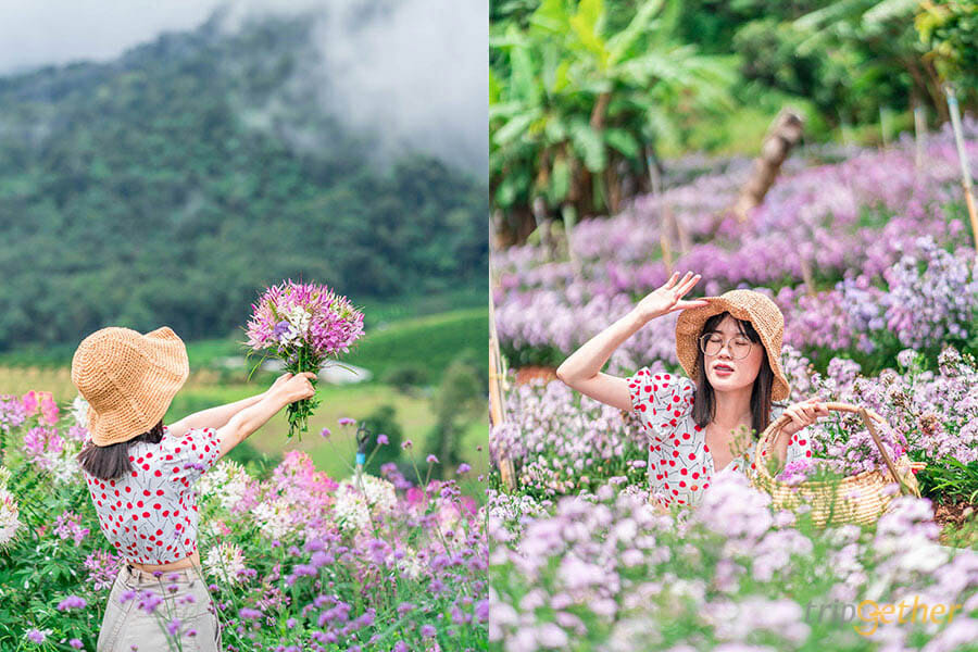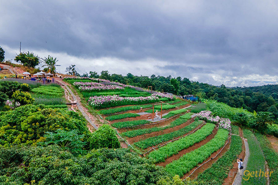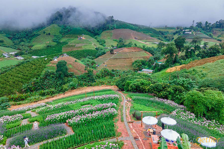 สัมผัสอากาศเย็นสดชื่น รับลมหนาวท่ามกลางหุบเขาที่ สวนดอก กอกาย สวนดอกไม้ที่รอให้คุณคนไปสัมผัสความงามของแปลงดอกไม้นานาชนิดไม่ว่าจะ เสี้ยนฝรั่ง เก๊กฮวย มากาเร็ต และเวอร์บีน่า ความพิเศษคือทางสวนดอกกอกายมีแยกถึง 3 สวน ให้ถ่ายรูปกันแบบจุกๆ มาถึงสวนดอกกอกายแล้วแนะนำให้นั่งจิบชาชมวิวสวยๆ จะเป็นชากุหลาบ ชาเขียว ชาสมุนไพรร้อน หรือจะลองกินข้าวปุ๊กดอย มันม่วง ก็สามารถปิ้งได้เองด้วย ถ้าพร้อมแล้วเตรียมชุดและพร็อพให้พร้อมแล้วไปเช็คอิน เดินเล่น ถ่ายรูปท่ามกลางสวนดอกไม้ จิบชา กินของอร่อย พร้อมชมวิวเขาแบบ 360 องศากันได้เลยที่ สวนดอกกอกาย