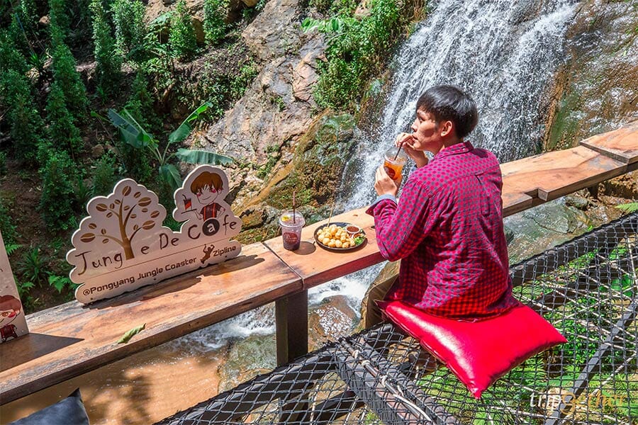จังเกิ้ล เดอ คาเฟ่ คาเฟ่บรรยากาศเย็นสบายท่ามกลางธรรมชาติ จุดพิเศษของร้านคือคุณสามารถนั่งชิลล์ดื่มเครื่องดื่มเย็นๆ จิบกาแฟ กินขนม พร้อมกับชมวิวธรรมชาติ ริมน้ำตก ฟังเสียงน้ำไหลอย่างผ่อนคลายในวันสบายๆ ในส่วนของที่นั่งทางร้านมีโซนให้เลือกมากมายทั้งแบบ Indoor แอร์เย็นๆ และ Outdoor รับอากาศสดชื่น ใครกำลังมองหาคาเฟ่นั่งชิลล์ วิวธรรมชาติ ในโซนม่อนแจ่มต้องจัดที่นี่เลย