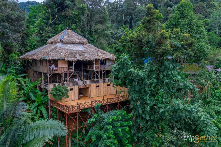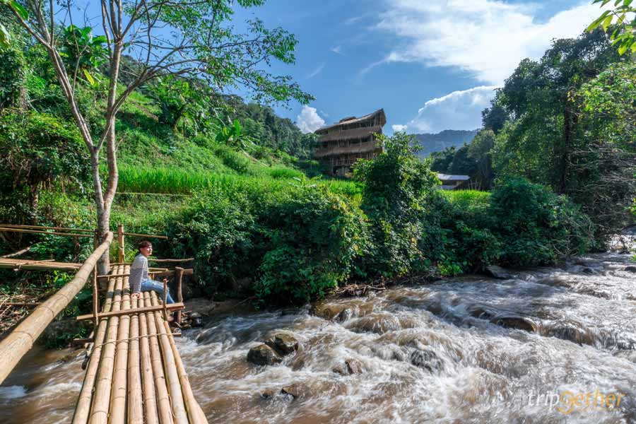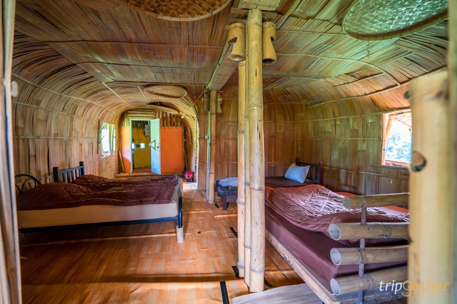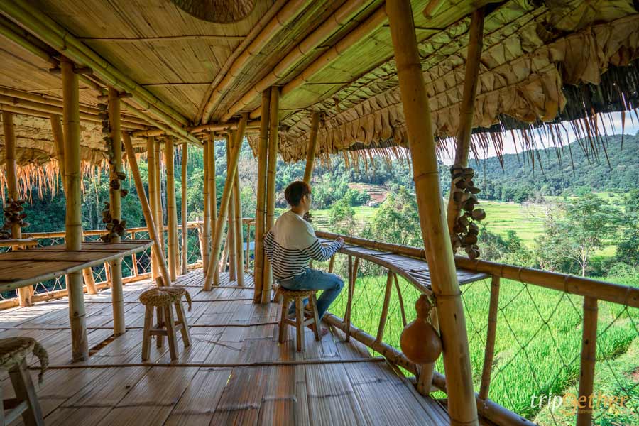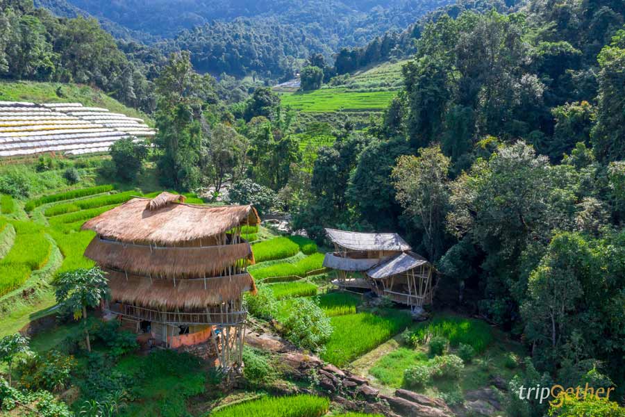 ขึ้นมานอนบนดอย กับ บ้านไม้ไผ่ยักษ์ (Giant Bamboo Hut) อีกหนึ่งที่พักกลางป่า เชียงใหม่ โอบล้อมด้วยทุ่งนาชั้นบันได พิกัดอยู่โซนดอยอินทนนท์ ตั้งอยู่ระหว่างเส้นทางเดินธรรมชาติผาดอกเสี้ยว ตัวที่พักใช้วัสดุจากธรรมชาติไม้ไผ่ สูงขนาด 3 ชั้น โดยชั้นที่ 2 เป็นเหมือนโซนส่วนกลางสำหรับต้อนรับลูกค้า สำหรับฤดูกาลท่องเที่ยวของที่นี่จะเริ่มตั้งแต่ช่วงเดือนกันยายน ไปจนถึงเดือนพฤศจิกายน ซึ่งเราจะได้ชมทุ่งนาสีเขียวขจี ยาวไปจนถึงช่วงเก็บเกี่ยวรวงข้าวสีทองในต้นฤดูหนาวเลยล่ะ