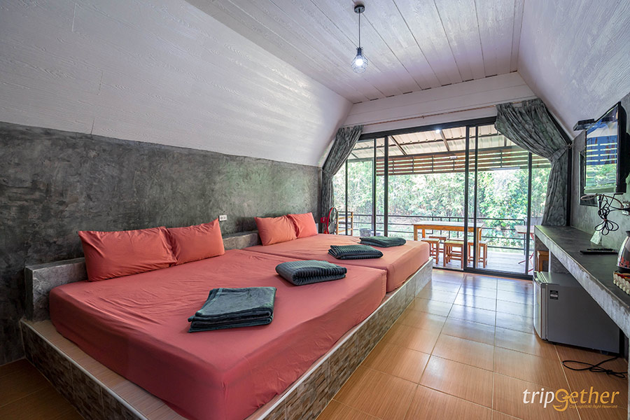 บ้านสวน ตวงรัก ที่พักจันทบุรี ติดลำธารฟีลบ้านตากอากาศ ตัวที่พักออกแบบเป็นสไตล์ลอฟท์ 2 ชั้น ดูเท่และทันสมัย ในขณะเดียวกันก็ดูสอดคล้องธรรมชาติรอบๆ สำหรับบ้านหลังนี้มีการแบ่งสัดส่วนอย่างลงตัว โดยชั้นบนเป็นห้องนอนขนาดใหญ่ เข้าพักได้ 8 – 10 คน และชั้นล่างมีห้องน้ำและห้องครัวที่สามารถตั้งเตาปิ้งย่างได้ นอกจากนี้ยังมีศาลาริมน้ำให้มานั่งชิลล์หรือทำกิจกรรมต่างๆ ส่วนใครอยากคลายร้อนก็สามารถโดดลงน้ำเย็นๆ หน้าที่พักได้เลย ถ้าใครมีแพลนเที่ยวเป็นกลุ่มใหญ่และชอบความเป็นส่วนตัว มาที่นี่โลดดด