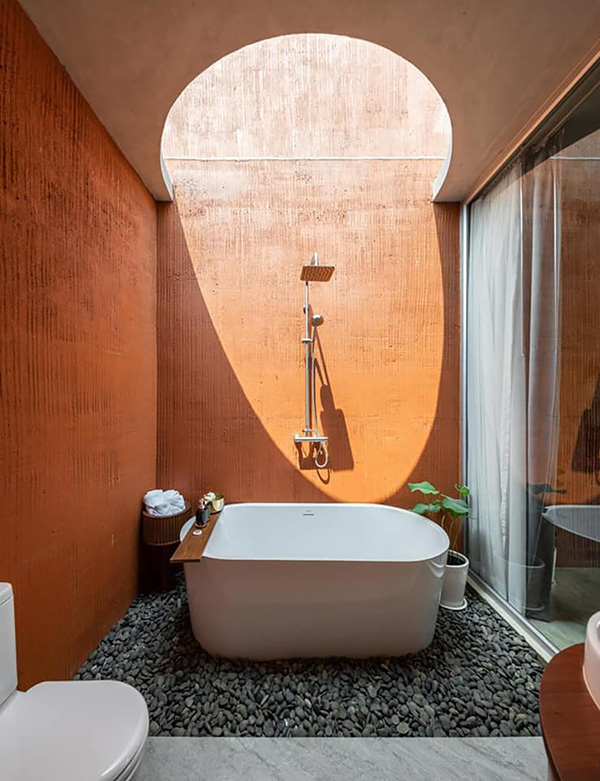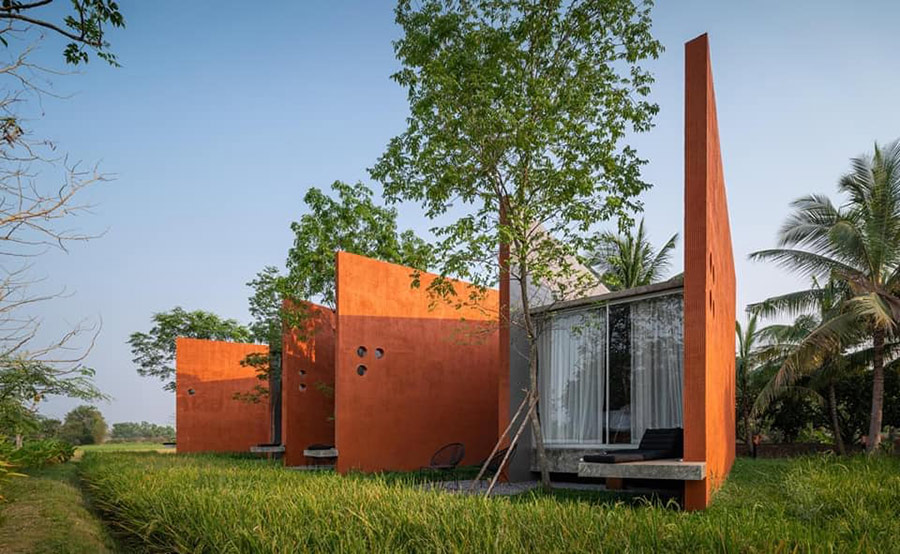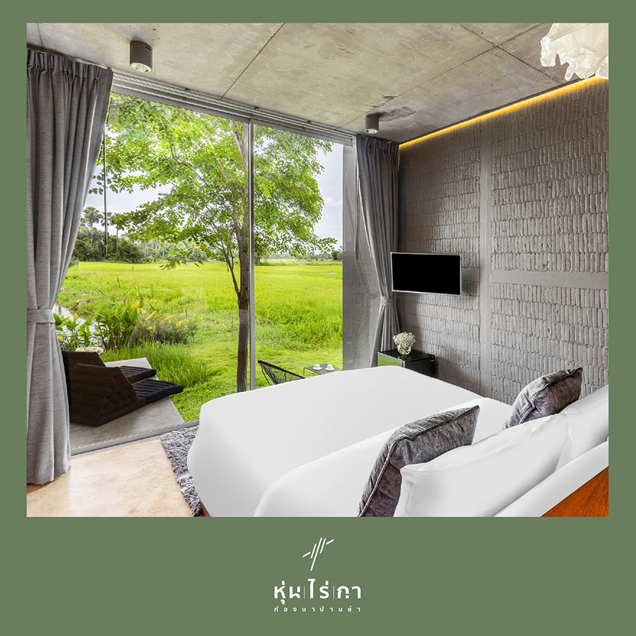 หุ่น ไร่ กา ที่พักและคาเฟ่พิษณุโลกมาพร้อมกับสถาปัตยกรรมอันโดดเด่นและแปลกตาท่ามกลางทุ่งนา การออกแบบเน้นความเรียบง่ายและดูเป็นส่วนหนึ่งกับธรรมชาติ ตัวอาคารมีลักษณะเป็นกำแพงสูงสีอิฐส้ม เรียกได้ว่าเป็นสีที่ตัดกับสีเขียวขจีของท้องนาได้อย่างเข้ากันมาก ส่วนห้องพักของที่นี่มีเพียง 4 ห้องเท่านั้น แต่ละห้องออกแบบมาอย่างทันสมัย พร้อมด้วยสิ่งอำนวยความสะดวกครบครัน ไฮไลท์ก็คือมีวิวทุ่งนาอย่างใกล้ชิด เพียงเปิดหน้าต่างก็สัมผัสได้ถึงความเฟรชของธรรมชาติ นอกจากนี้ทางที่พักยังมีบริการอาหารเช้าแสนอร่อยและคาเฟ่บรรยากาศชิลล์ๆ และมีมุมถ่ายรูปที่สายโซเชียลต้องถูกใจแน่นอน