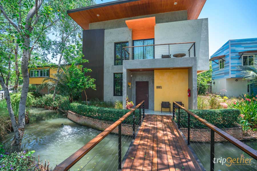 มานอนพักผ่อนกับบรรยากาศร่มรื่นเย็นสบาย และนั่งปิ้งย่างหมูกระทะแบบชิลล์ๆ ที่ บ้านสุจิปุรี (Baan SujiPuri) ที่พักริมน้ำใกล้กรุงเทพ ที่ออกแบบมาในสไตล์มินิมอลผสมผสานการตกแต่งสไตล์บ้านดินได้อย่างลงตัวและมีเอกลักษณ์มากๆ บ้านพักทุกหลังมีความเป็นส่วนตัว มีแบบบ้านแอร์ติดริมน้ำ บ้านพัดลมติดริมน้ำ บ้านแอร์ไม่ติดริมน้ำ และบ้านพัดลมไม่ติดริมน้ำ มีให้เลือกพักทั้งแบบ 2 คน ไปจนถึง 10 คนเลยล่ะ แถมพาน้องหมาเข้าพักได้ด้วยนะ และมีพื้นที่ระเบียงนั่งเล่นให้ปิ้งย่างกินหมูกระทะฟินๆ