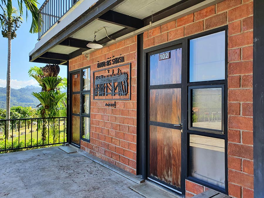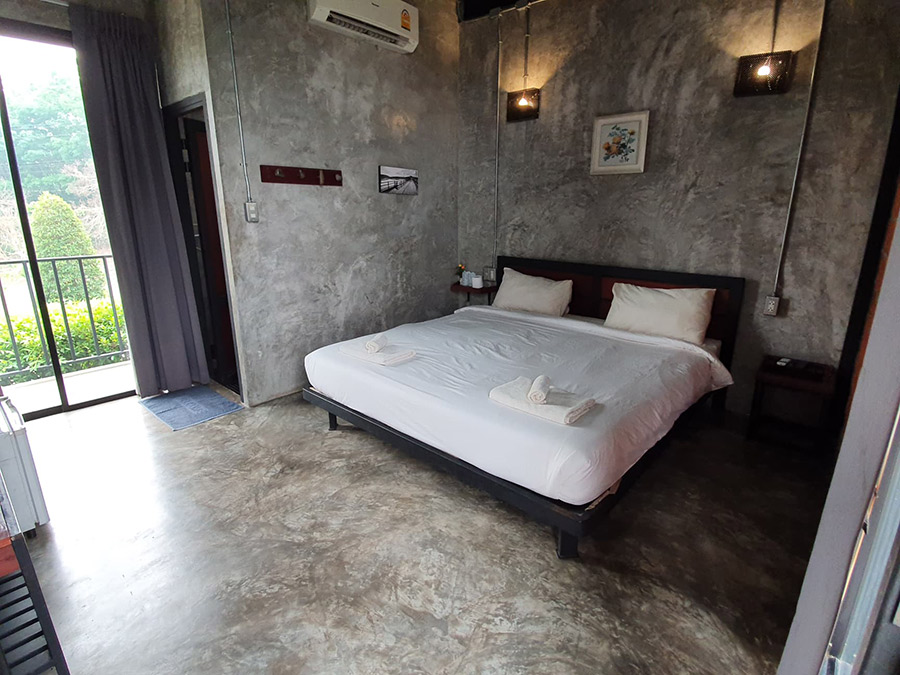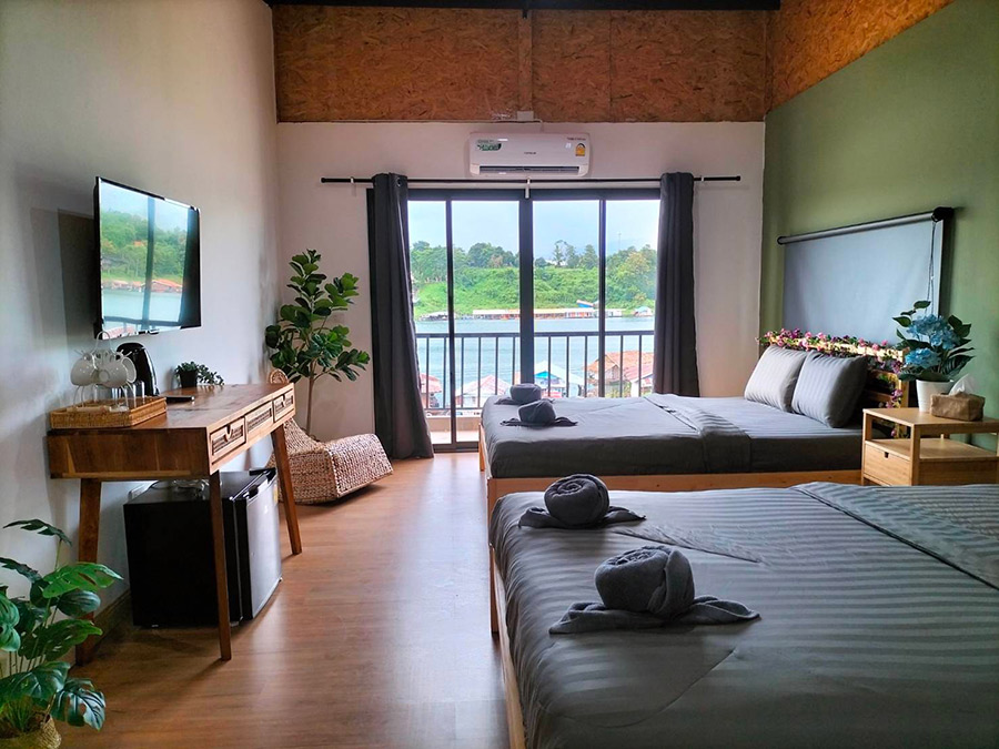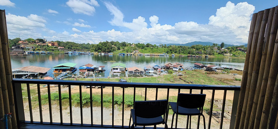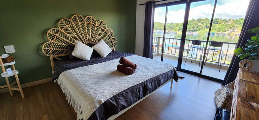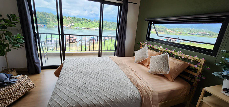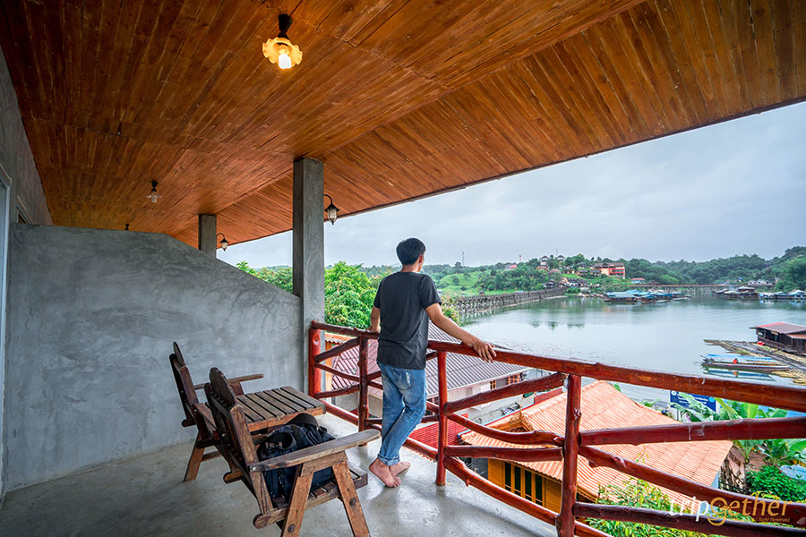 Monstay ที่พักสังขละบุรีวิวแม่น้ำแบบพาโนราม่า ตั้งอยู่ห่างจากสะพานมอญประมาณ 400 เมตรหรือใช้เวลาเดินประมาณ 5 นาทีเท่านั้น ในส่วนของห้องพักตกแต่งอย่างสวยงามให้ความรู้สึกแบบ Cozy แสนอบอุ่นที่เน้นการใช้เฟอร์นิเจอร์หวายและไม้เป็นหลักไม่เท่านั้นแต่ละห้องยังมีระเบียงที่สามารถชมวิวสะพานมอญ วิถีชีวิตของชุมชนมอญ และธรรมชาติที่สบายตารับรองว่าดีต่อใจแน่นอน แอบกระซิบว่าใครมาเช็คอินในช่วงปลายฝนต้นหนาวที่จากระเบียงยังสามารถมองเห็นหมอกและสัมผัสอากาศเย็นได้แบบเต็มๆ อีกด้วย สายเที่ยวคนไหนกำลังมองหาที่พักชิคๆ วิวสวยๆ ห้ามพลาดที่นี่เลย Monstay