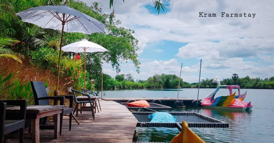 Kram Farmstay ฟาร์มสเตย์ใกล้กรุงเทพที่มาพร้อมกับธรรมชาติแบบจัดเต็ม บรรยากาศในที่พักเต็มไปด้วยความร่มรื่นของเงาไม้ใหญ่ เพียงเดินเข้ามาก็ให้ฟีลเหมือนญาติที่ต่างจังหวัด ในส่วนของตัวที่พักมี 2 ชั้นตั้งเรียงรายอยู่ริมน้ำ ทุกห้องหันหน้าเข้าหาทะเลสาบขนาดใหญ่ เรียกได้ว่าสามารถมองวิวจากในห้องได้แบบฟินๆ สำหรับกิจกรรมในที่พักส่วนใหญ่จะเป็นกิจกรรมทางน้ำสนุกๆ ไม่ว่าจะเป็นพายเรือซับบอร์ด เล่นน้ำ ปั่นเป็ด หรือถ้าใครไม่อยากเล่นน้ำก็มีปั่นจักรยานชิลล์ๆ เหมือนกัน และนอกจากโซนที่พัก ยังมีส่วนของคาเฟ่และร้านอาหารคอยบริการด้วย ใครที่อยากเน้นพักผ่อนในที่เดียวจบ ปักหมุดมาที่นี่โลด