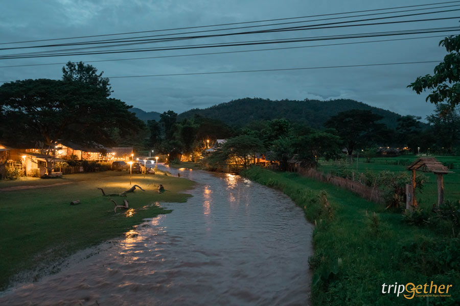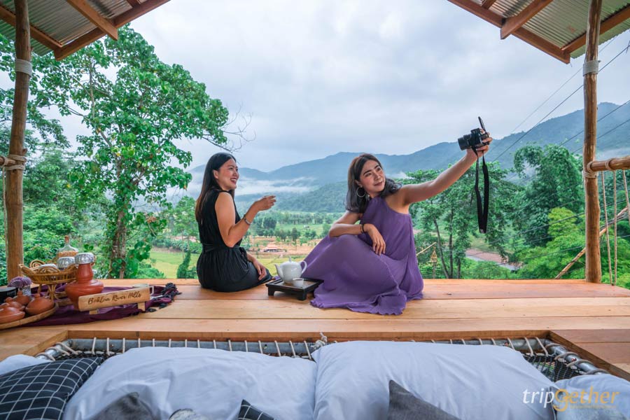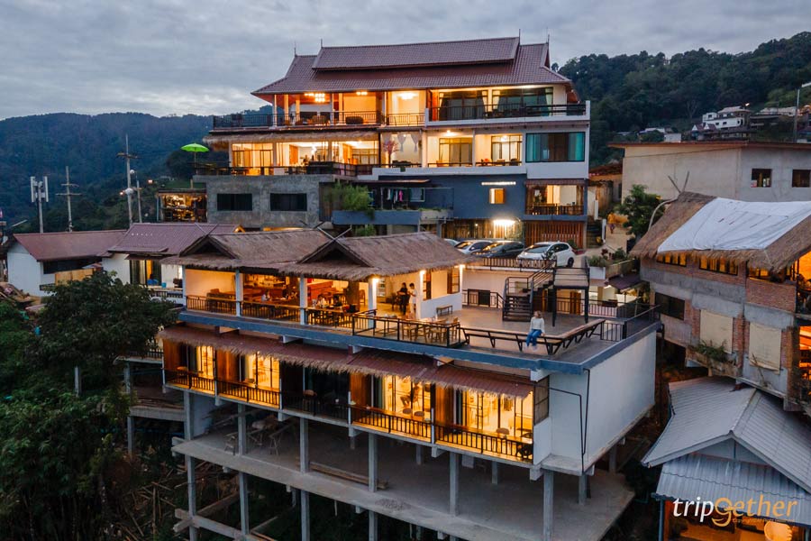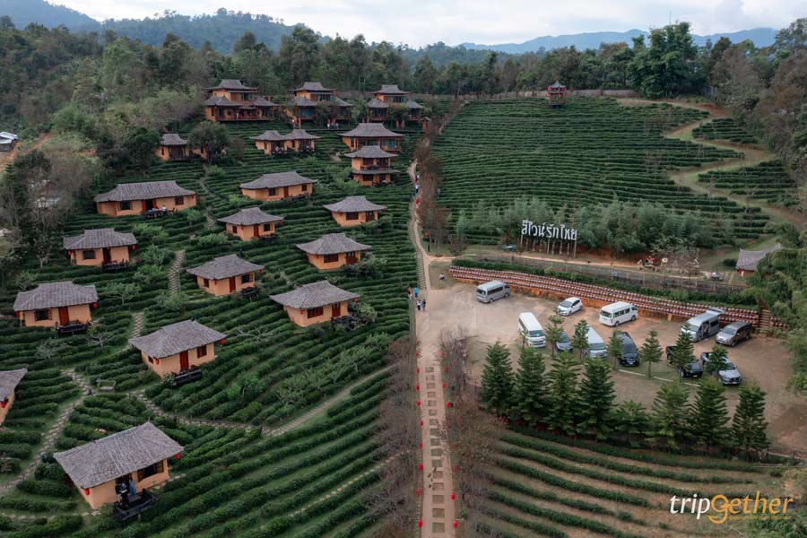 มาเริ่มกันที่ หมู่บ้านรักไทย หมู่บ้านเล็กๆ ในอ้อมกอดของขุนเขา ที่ยังคงวิถีชีวิตแบบชาวจีนยูนนาน มีทะเลสาบกลางหมู่บ้านและไร่ชาเรียงรายกันอย่างสวยงาม บรรยากาศเงียบสงบคล้ายเมืองจีนโบราณให้ความรู้สึกเหมือนอยู่ในซีรีส์จีนย้อนยุคเลยล่ะ ไฮไลท์ของที่นี่คือตื่นเช้าเปิดหน้าต่างมาชมทะเลหมอกฟุ้งๆ ที่ลอยเหนือทะเลสาบกลางหมู่บ้านพาดผ่านด้วยเรือจีนนับสิบลำ บอกเลยว่าเป็นภาพที่สวยอย่างกับภาพวาด จดลิสต์ไว้ชวนหวานใจมานอนพักจิบชาฟินๆ