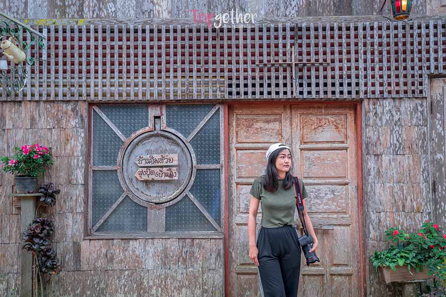 ตกท้ายด้วยร้านสุดท้ายในโซนหมู่บ้าน เปิ้นกะตั๋ว คาเฟ่ ร้านกาแฟชื่อเสียงน่ารัก ที่บรรยากาศและดีไซน์ของร้านก็คิ้วท์ไม่แพ้กัน ร้านนี้อยู่ปากทางเข้าหมู่บ้านเลย เรียกว่าไม่ว่าใครจะต้องผ่านตากับความน่ารักอย่างแน่นอน ตัวร้านเป็นบ้านไม้ซึ่งตกแต่งด้วยเฟอร์นิเจอร์สีพาสเทล ให้กลิ่นอายของความวินเทจ มากด้วยมุมสวยในการถ่ายรูปน่ารักๆ ส่วนด้านหลังเป็ระเบียงกว้างและมีธารน้ำไหลผ่าน สั่งเครื่องดื่มมาชิลล์มุมนี้รับรองว่าฟิน
