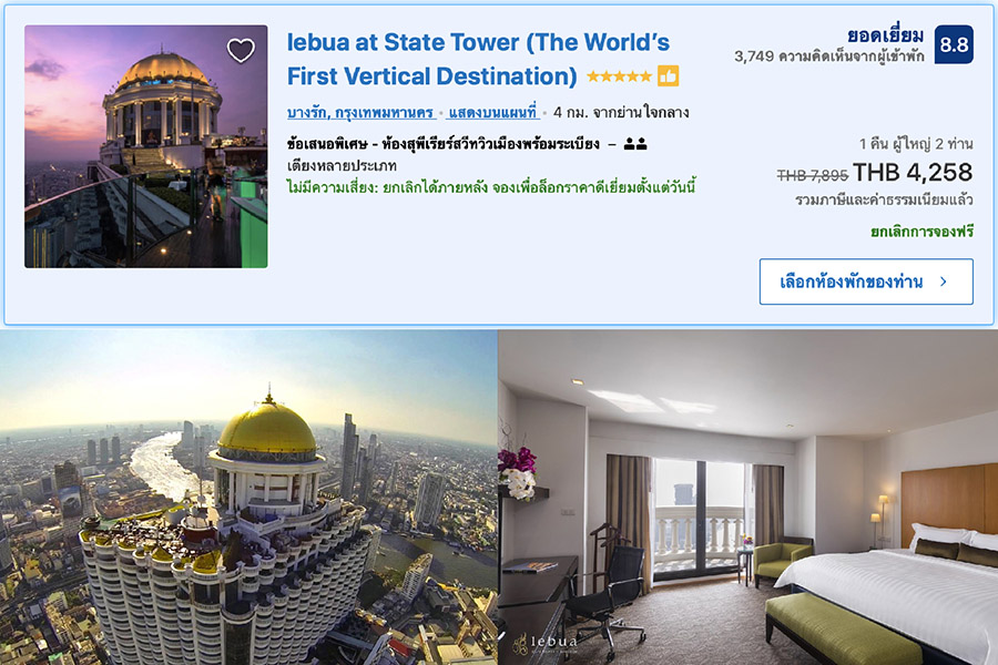 เริ่มต้นกันที่ เลอบัว แอท สเตททาวเวอร์ สุดยอดโรงแรมหรูในกลางกรุงเทพที่มีจุดเด่นเป็นตึกสูงเป็นอันดับต้นๆ ของเมืองไทย ไฮไลท์ที่สำคัญของที่นี่คือ Rooftop Restaurant ที่สามารถมองเห็นวิวกรุงเทพได้แบบ 360 องศา ภายในห้องพักยังตกแต่งอย่างหรูหรามาพร้อมสิ่งอำนวยความสะดวกที่ทันสมัยอย่างครบครัน มาพร้อมระเบียงส่วนตัวที่สามารถชมความสวยงามของแม่น้ำเจ้าพระยาและสีสันของกรุงเทพได้แบบฟินๆ