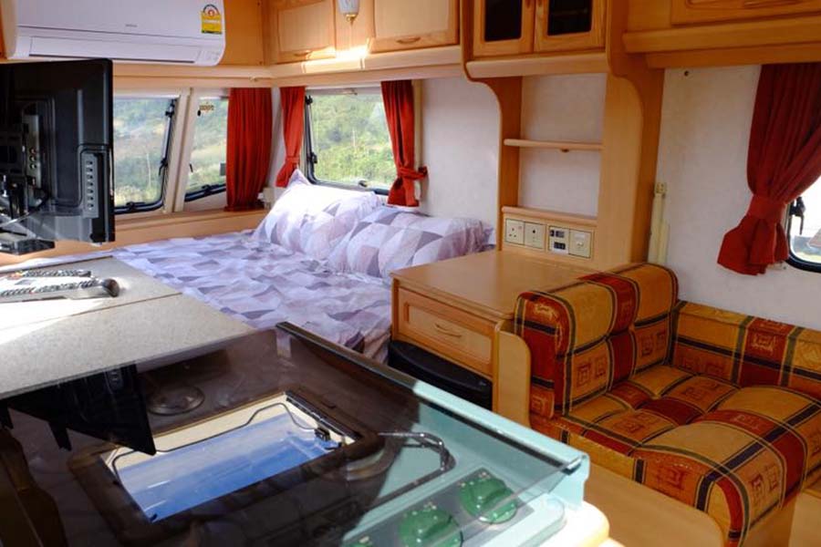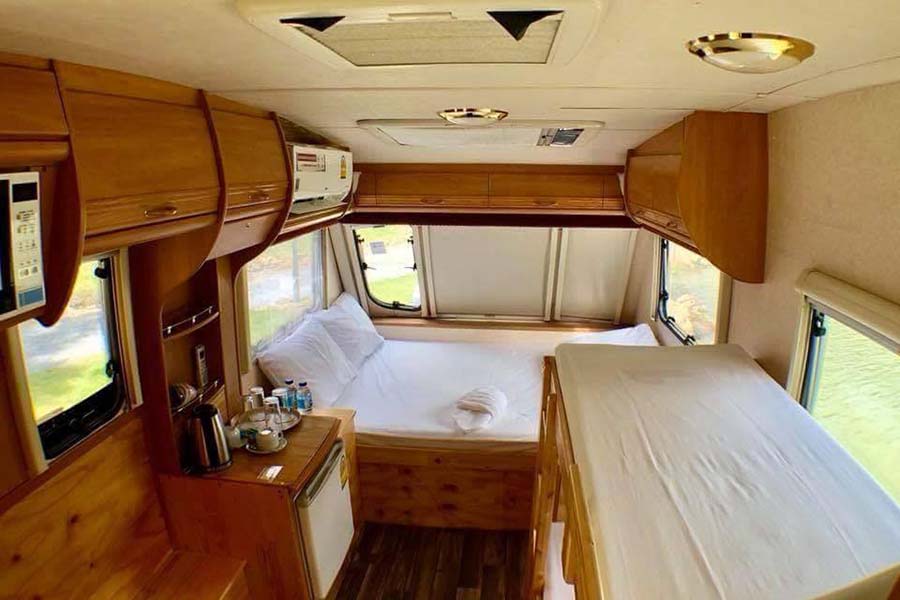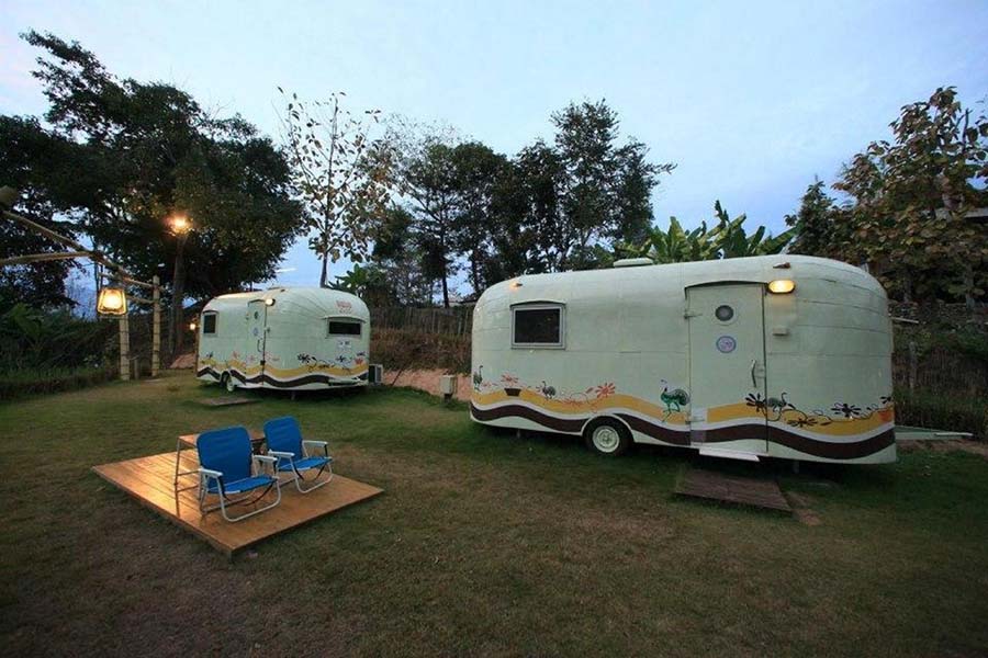 Price: รถบ้านราคาวันธรรมดา 2,500 – 3,500 บาท, ศุกร์-เสาร์และนักขัตฤกษ์ 3,900-5,500 บาท /พัก 2 คน, เตียงเสริม 600 บาท (ราคารวมอาหารเช้า)
