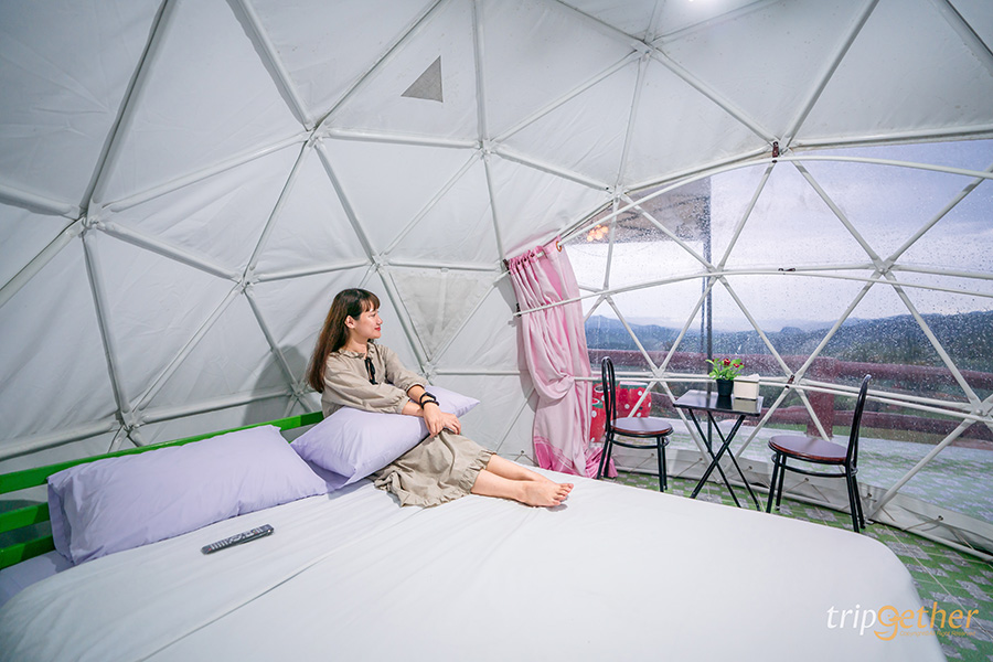 แคมป์ภูชี้ฟ้า ที่พักสไตล์แกลมปิ้งบนภูชี้ฟ้า เหมาะกับคนที่อยากนอนสบายๆ แต่ก็ยังใกล้ชิดธรรมชาติ สำหรับเต็นท์โดมใสของที่นี่มีทั้งหมด 6 หลัง 2 แบบ ก็คือเต็นท์โดมขนาด 5 เมตรและเต็นท์โดมขนาด 4 เมตร เต็นท์แต่ละหลังตั้งอยู่บนเนินที่ไล่ระดับกันไป ทำให้ไม่ต้องห่วงว่าจะโดนบังวิว ทุกห้องจะเห็นภาพความสวยงามของเนินเขาน้อยใหญ่และทะเลหมอกแบบเต็มๆ ส่วนภายในเต็นท์ตกแต่งอย่างน่ารัก ให้ฟีลอบอุ่นเหมือนอยู่ทางยุโรป เหมาะกับสายคอนเทนต์ ชอบถ่ายรูปสวยๆ อัปลงโซเชียลมาก อีกทั้งยังมีเตียงนอนนุ่มๆ มีสิ่งอำนวยความสะดวกต่างๆ และเต็นท์ทุกหลังมีห้องน้ำส่วนตัว นอกจากนี้ใครสายกินชาบูบนดอยก็ห้ามพลาดสั่งชาบูร้อนๆ เป็นมื้อเย็นปิดท้ายวัน บอกเลยว่าใครมองหาที่พักเชียงรายบนเขา ปักหมุดแคมป์ภูชี้ฟ้าโลดดด