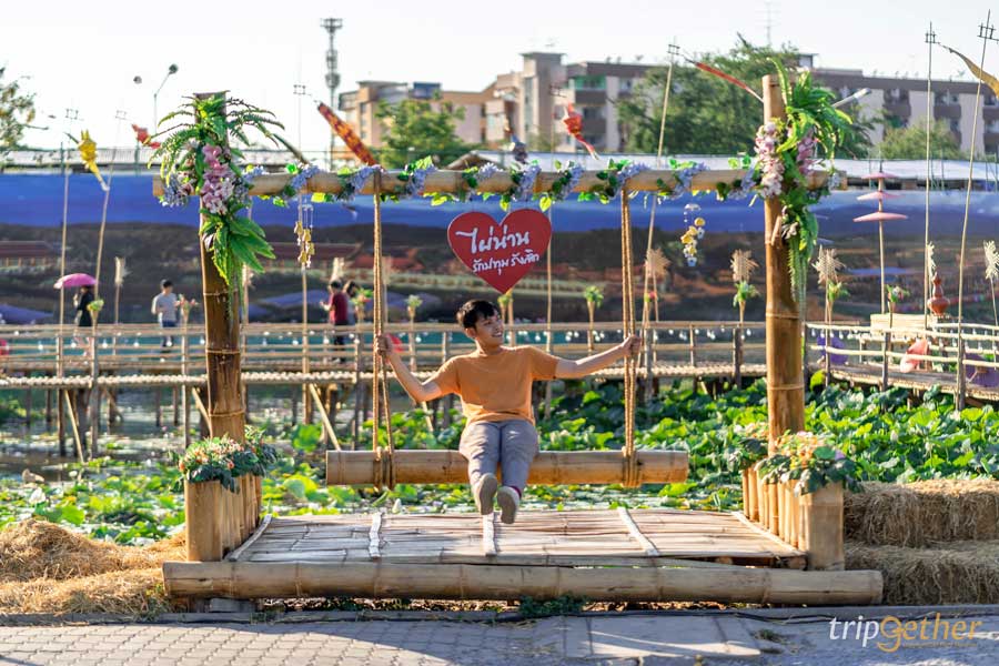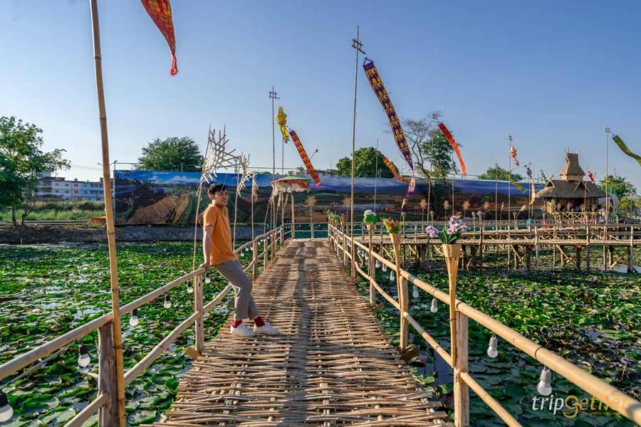 เอาใจสายถ่ายภาพ มาถ่ายรูปชิคๆ กันที่ สะพานไม้ทุ่งรังสิต ตั้งอยู่ตรงข้ามฟิวเจอร์พาร์ครังสิต ใกล้ๆ กับที่จอดรถตู้ต่างจังหวัด ไฮไลท์ของที่นี่คือมีสะพานไม้ไผ่ที่ทอดยาวลงไปในบ่อบัวขนาดใหญ่สีเขียวสดใสสบายตา และแยกไปตามมุมต่างๆ ที่สองฝั่งจะมีรั้วกั้นและประดับประดาด้วยตุง โคม และต๋าแหลว ซึ่งเป็นสัญลักษณ์ที่ช่วยให้แคล้วคลาดจากภัย โดยในแต่ละเทศกาลบริเวณสะพานไม้ทุ่งรังสิตแห่งนี้ก็จะมีการตกแต่งสวยงามแตกต่างกันไปในแต่ละช่วง เช่น ปีใหม่ ตรุษจีน สงกรานต์ ลอยกระทง ใครขับรถผ่านก็อดใจที่จะลงไปถ่ายรูปไม่ได้เลยจริงๆ แนะนำว่าให้มาช่วงเช้าหรือไม่ก็เป็นช่วงเย็นไปเลย เพราะแสงจะสวยและบ่อบัวก็ดูสวยสดชื่นมากสมกับเป็นปทุมธานีเมืองถิ่นบัวหลวงเลยล่ะ
