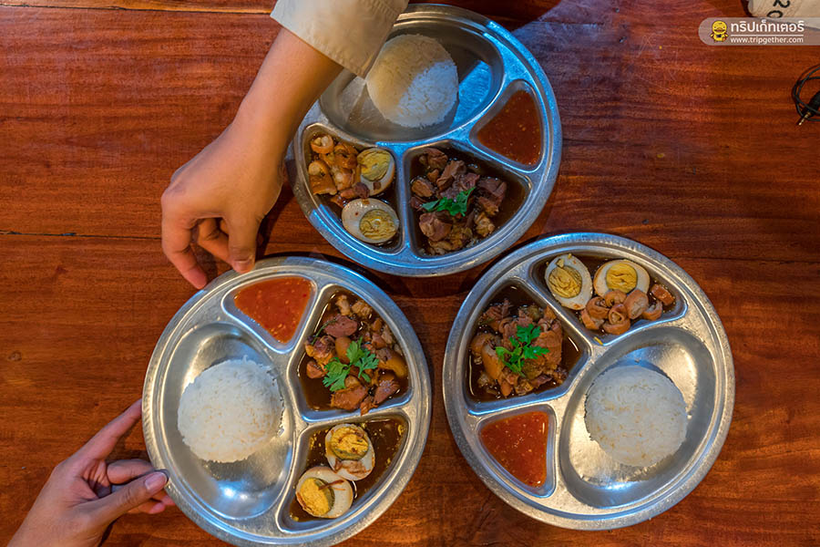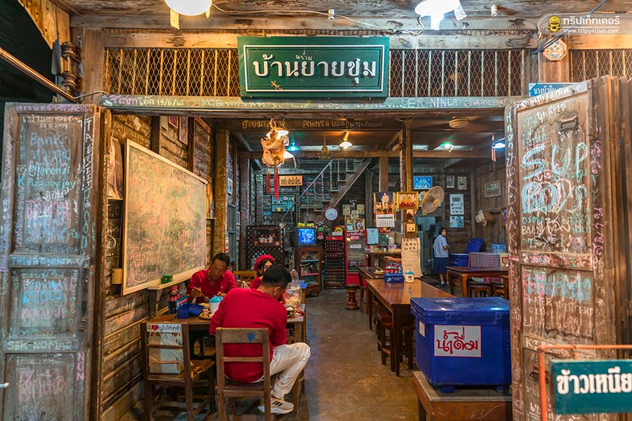 ยายชุม ข้าวขาหมูโบราณ ตัวร้านตั้งอยู่ภายในเรือนไม้เก่าแก่เพียงแต่เดินผ่านก็ต้องสะดุดตาไปกับสีชอล์กที่เขียนจนเกือบเต็มทั้งผนังไม้ภายในร้าน สำหรับเมนูก็มีให้เลือกทั้ง ข้าวขาหมู ข้าวขาหมู+ไข่ ข้าวขาหมู+ไส้ ที่เสิร์ฟมาในถาดสแตนเลสสุดน่ารักให้ความรู้สึกย้อนไปในวัยเด็กอย่างไงอย่างงั้น แถมยังมีที่นั่งภายในร้านให้เลือกมากมาย นอกจากนี้แล้วในช่วงเช้ายังมีข้าวเหนียวหมูและแจ่วบ่องให้ลิ้มลองกันอีกด้วย
