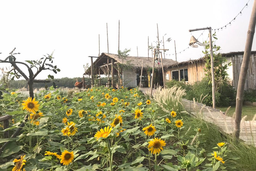 หนีมารับโอโซนดีๆ แบบใกล้กรุงกันที่ เด็ดดอกไม้สะเทือนถึงดวงดาว Coffee & Craft แค่ชื่อก็ดีงามแล้ว แต่ภายในร้านเด็ดกว่าด้วยบรรยากาศริมน้ำ แถมมาพร้อมมุมถ่ายรูปสวยๆ เพียบทั้งทุ่งดอกหญ้า ทุ่งทานตะวัน ทุ่งปอเทือง สะพานไม้ไผ่ ชิงช้า เปลนอน และอีกหลายมุมเลยทีเดียว สะเทือนสะท้านด้วยตัวร้านสาย ECO ที่นำไม้ที่ใช้แล้วกลับมาใช้ซ้ำสร้างตัวร้านที่โปร่งให้ลมพัดผ่านเข้ามาในตัวร้านได้ตลอดเวลา มีโซนให้เลือกนั่งได้ทั้งห้อยขาริมน้ำ นั่งเปลไม้ชมวิวสวย และอีกหลากหลายมุมให้เลือกได้ตามใจชอบ ยิ่งมาเที่ยวในยามเย็นแล้วจะได้ชมวิวสวยของพระอาทิตย์ลาลับขอบฟ้าชมแสง Twilight ของบางปูอันสวยงามได้แบบไม่เหมือนใคร หากใครกำลังหาร้านน่านั่งบรรยากาศดีก็แวะมาชิลล์กันได้นะ