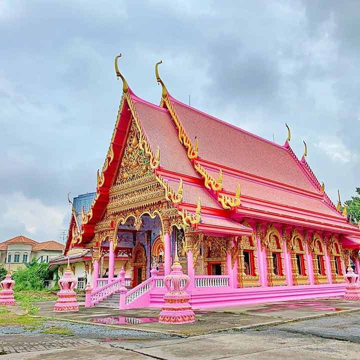วัดที่มาพร้อมโบสถ์สีชมพูอันสวยสดงดงามที่แปลกตาและไม่เคยเห็นที่ไหนมาก่อน ซึ่งแต่เดิมวัดแห่งนี้เป็นวัดร้างที่สร้างขึ้นในสมัยกรุงศรีอยุธยาแต่ถูกทิ้งร้างไว้กว่า 200 ปี ต่อมาหลวงพ่อศรีนวลได้เดินทางธุดงค์มาจากจ.เชียงใหม่ จึงได้บูรณะซ่อมแซมและสร้างอุโบสถขึ้นใหม่และเมื่อกลางปี 2553 พระอาจารย์ประสิทธิ์ได้มาดำรงตำแหน่งเจ้าอาวาสจึงทาสีโบสถ์ทั้งหลังให้เป็นสีชมพูเพราะเป็นสีที่มีความหมายประจำพระองค์ พระบาทสมเด็จพระจุลจอมเกล้าเจ้าอยู่หัว