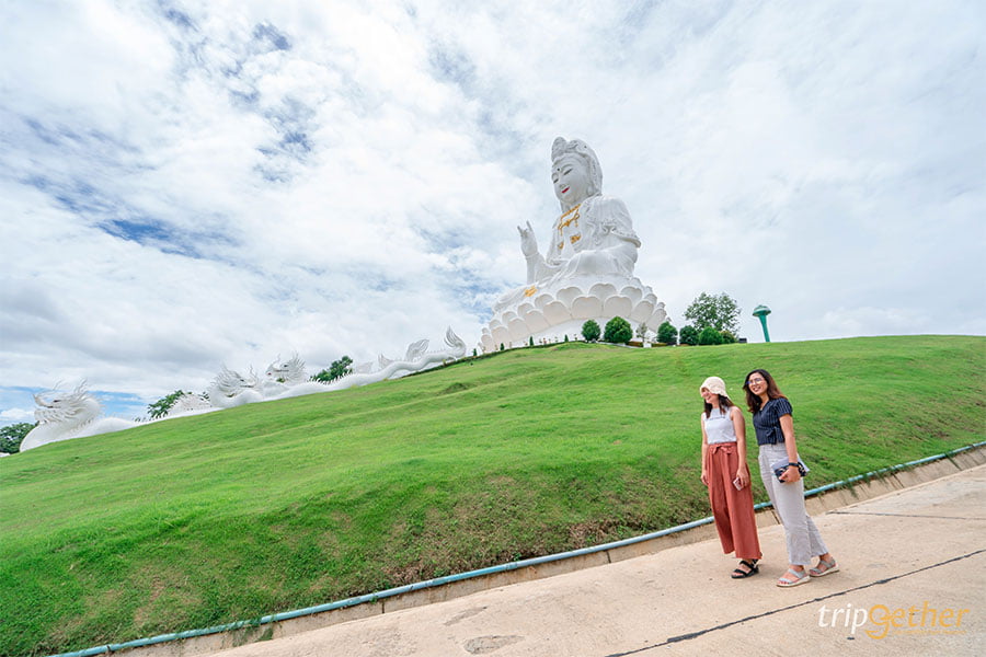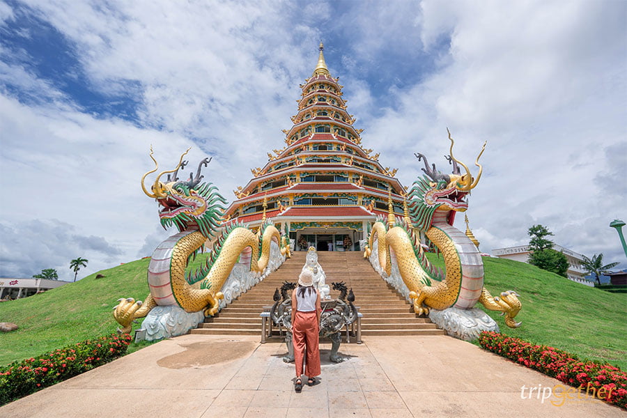 วัดห้วยปลากั้ง วัดชื่อดังของเชียงราย ตัววัดตั้งอยู่บนเนินเขาโดดเด่นด้วยเจดีย์สูง 9 ชั้นที่มีรูปทรงทางสถาปัตยกรรมที่สวยงามและแปลกตา มีลักษณะเป็นทรงแหลมซึ่งได้รับแรงบันดาลใจมาจากเจดีย์ของจีนผสมผสานกับความเป็นล้านนาได้อย่างลงตัว ภายในเจดีย์พบโชคธรรมเจดีย์ยังประดิษฐานพระพุทธรูปและพระอรหันต์ปางต่างๆ บริเวณโดยรอบจะมีเจดีย์ 12 ราศี รวมถึงรูปปั้นเจ้าแม่กวนอิมที่แกะสลักจากไม้จันหอมองค์ใหญ่ที่สะดุดตามาแต่ไกล