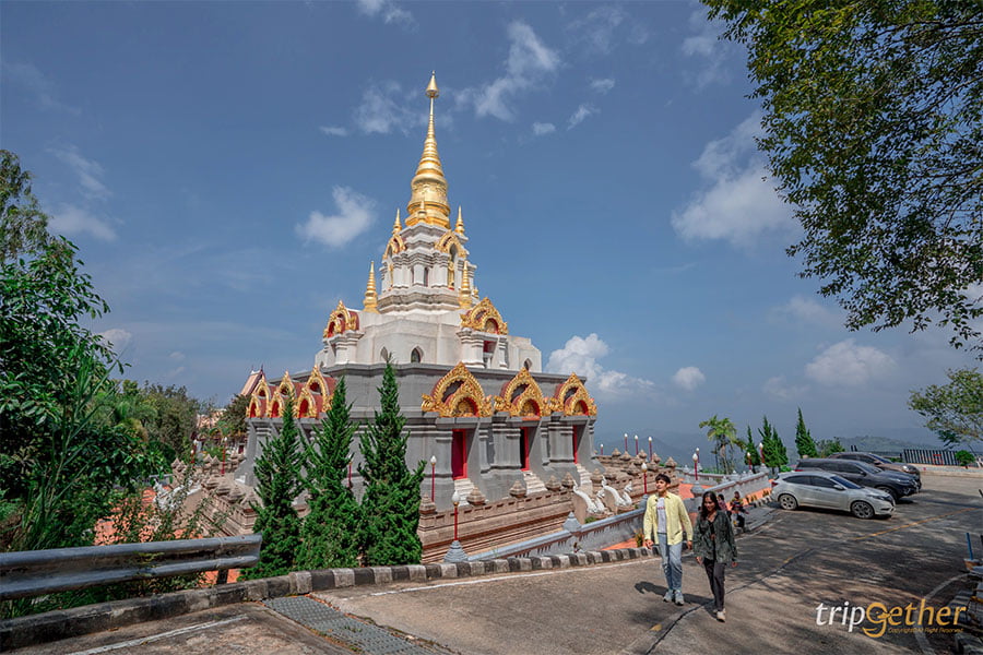 วัดเฉลิมพระเกียรติพระจอมเกล้าราชานุสรณ์ หรือชื่อเดิมว่า วัดพระพุทธบาทปู่ผาแดง วัดนี้ตั้งอยู่บนยอดเขาสูงที่สร้างจากแรงศรัทธาของชาวบ้าน ซึ่งต้องใช้บริการรถของชาวบ้านและเดินเท้าขึ้นเขาอีกประมาณ 1 กิโลเมตร ด้านมีวิวให้ชมกันแบบ 360 องศา และจุดไฮไลท์ก็คือเจดีย์สีขาว ที่เรียงรายเหนือหินได้อย่างอัศจรรย์ ถูกยกให้เป็น 10 อันดับ Unseen Thailand ที่ครั้งนึงในชีวิตต้องมาให้ได้สักครั้ง!