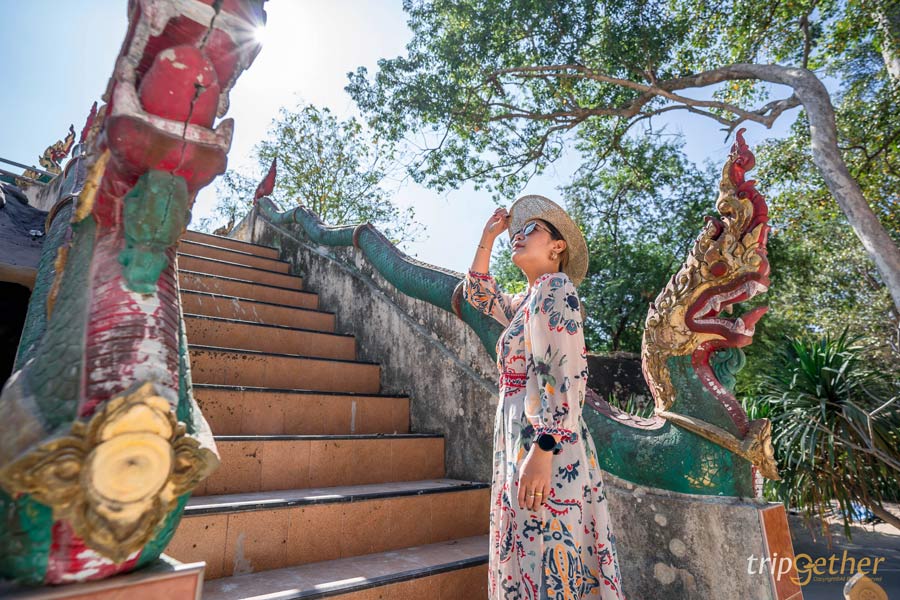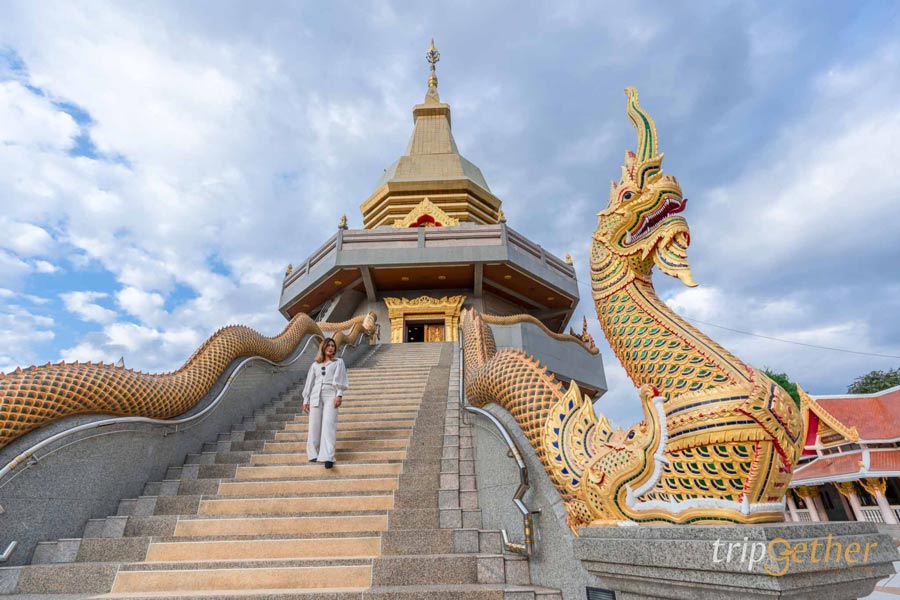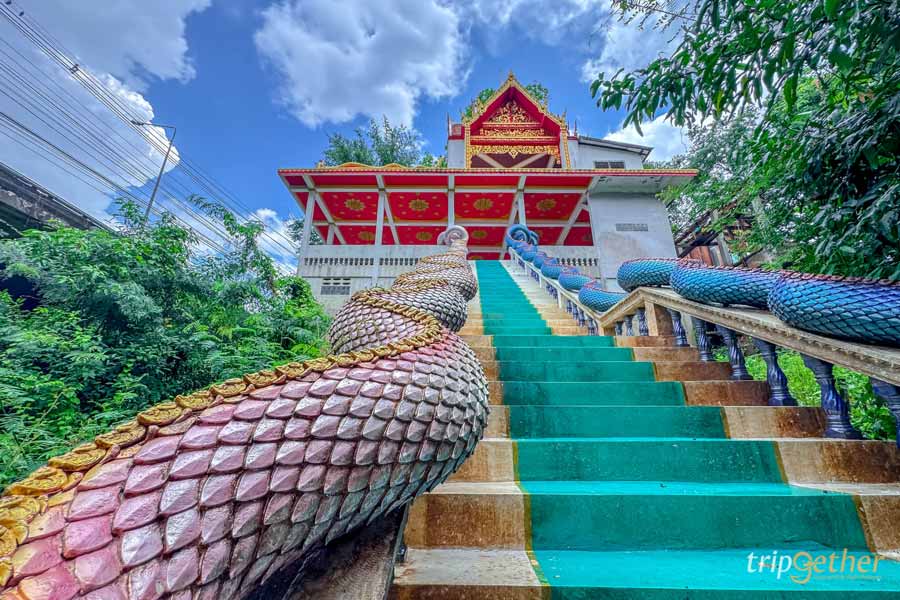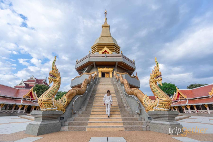 ถัดมาที่ วัดมรุกขนคร อีกหนึ่ง วัดสวย ภาคอีสาน ที่โดดเด่นด้วย พระมหาเจดีย์มรุกขนคร ซึ่งได้รับแรงบันดาลใจจากพระธาตุพนม ไฮไลท์อยู่ที่ลวดลายพุทธศิลป์อันประณีตทั้งภายนอกและภายในเจดีย์ที่ตกแต่งอย่างวิจิตรตระการตา เป็นจุดถ่ายรูปยอดนิยมของสายบุญเลยก็ว่าได้ และที่นี่เป็นองค์พระธาตุประจำวันเกิดของผู้ที่เกิด วันพุธกลางคืน นอกจากนี้ยังมีอีกจุดไฮไลท์คือ บันไดพญานาค พร้อมสักการะขอพร ขอโชคขอลาภจากองค์พญานคารที่เชื่อว่าเป็นผู้ปกปักษ์รักษาวัดแห่งนี้