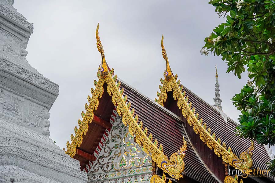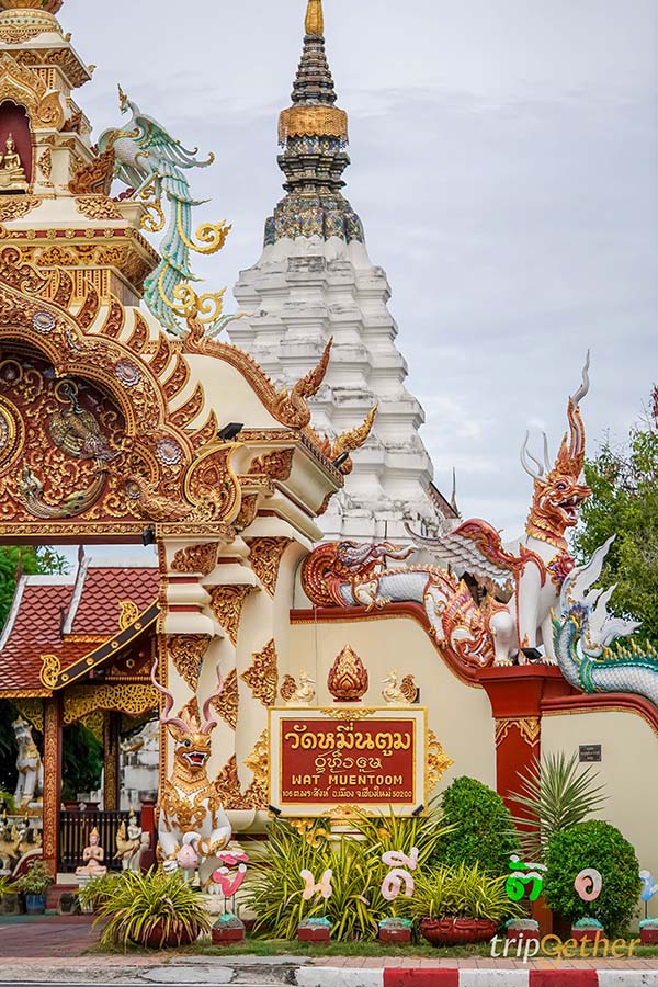 วัดหมื่นตูม วัดสวยกลางเวียงเชียงใหม่ ที่โดดเด่นด้วยวิหารที่มีโครงสร้างไม้เป็นหลัก เป็นวิหารล้านนาทรงเตี้ยและมีหลังคาซ้อนชั้น ด้านหน้าวิหารตกแต่งด้วยลวดลายสีทองสวยงาม และยังมีหน้าบันแบบม้าต่างไหม ซึ่งแสดงถึงความเป็นสถาปัตยกรรมแบบล้านนา นอกจากนี้พระเจดีย์ประธานของวัดเป็นจดีย์สีขาวย่อมุมทั้งองค์ เป็นอีกหนึ่งวัดสวยในคูเมืองเชียงใหม่ ที่ไม่ควรพลาด!