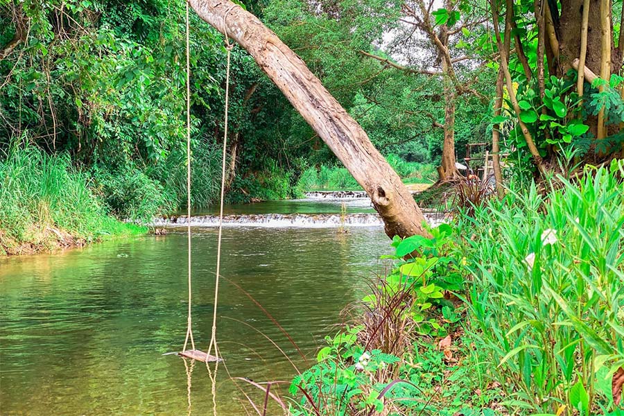 สายธารและขุนเขา สวนผึ้ง แค่ชื่อรีสอร์ทก็สามารถบอกเราได้แล้วว่าที่นี่ล้อมรอบไปด้วยขุนเขาและอยู่ใกล้สายธารน้ำทำให้มีบรรยากาศสดชื่น และอากาศดีท่ามกลางธรรมชาติ ต้นไม้ที่โอบล้อมทั่วทั้งรีสอร์ท เหมาะสำหรับคนที่อยากพักผ่อนท่ามกลางธรรมชาติ ฟังเสียงน้ำไหลของลำธารที่ไม่เคยแห้งหายจากป่าต้นน้ำเทือกเขาตะนาวศรี สายธารและขุนเขา สวนผึ้งมีทั้งบ้านพักเป็นหลังให้ได้เข้าพักผ่อน หรือถ้าใครอยากนอนเต็นท์ทางรีสอร์ทมีบริการให้เช่า และสำหรับใครที่เป็นสายแคมป์ปิ้งมีเต็นท์เป็นของตัวเองก็สามารถมาที่นี่เพื่อใช้บริการจุดกางเต็นท์ได้เหมือนกัน