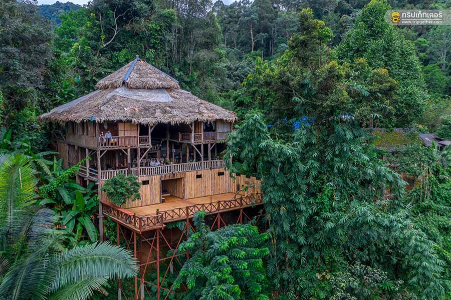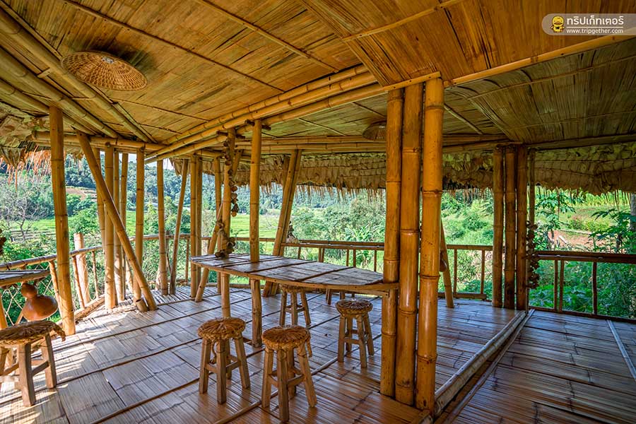 สำหรับใครที่อยากหนีความวุ่นวายจากเมืองกรุงและชื่นชอบธรรมชาติ ไม่ควรพลาดที่นี่เลย “บ้านไม้ไผ่ยักษ์” ที่พักทำจากไม้ไผ่ทั้งหลัง สูงขนาด 3 ชั้น ถูกออกแบบมาในสไตล์บาหลีผสมผสานกับธรรมชาติในพื้นที่ได้อย่างลงตัว ภายในที่พักมี 2 ห้องนอน 2 ห้องน้ำ รองรับได้ 10 คน ผู้เข้าพักต้องจองล่วงหน้าทุกครั้ง เนื่องจากที่นี่เขารับนักท่องเที่ยวแค่วันละหนึ่งกรุ๊ปเท่านั้นน มาพักสองคนก็ได้บ้านทั้งหลังไปเลย เป็นส่วนตัวสุดๆ แถมยังได้สูดอากาศบริสุทธิ์ท่ามกลางภูเขาและทุ่งนาขั้นบันไดที่รายล้อมรอบบริเวณที่พัก มีลมเย็นๆ พัดตลอดเวลา กลางคืนก็นอนฟังเสียงน้ำจากลำธารไหลเอื้อยๆ เรียกว่าเป็นความเงียบสงบและเป็นอีกหนึ่งตัวเลือกที่ดีเลยทีเดียว