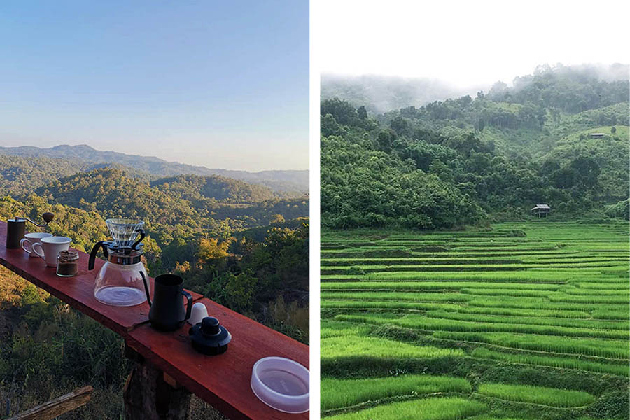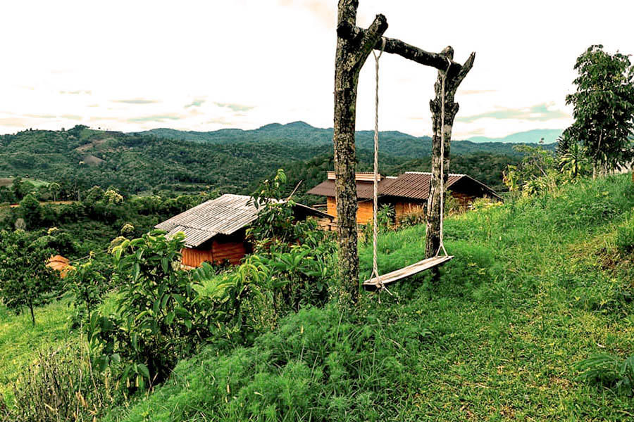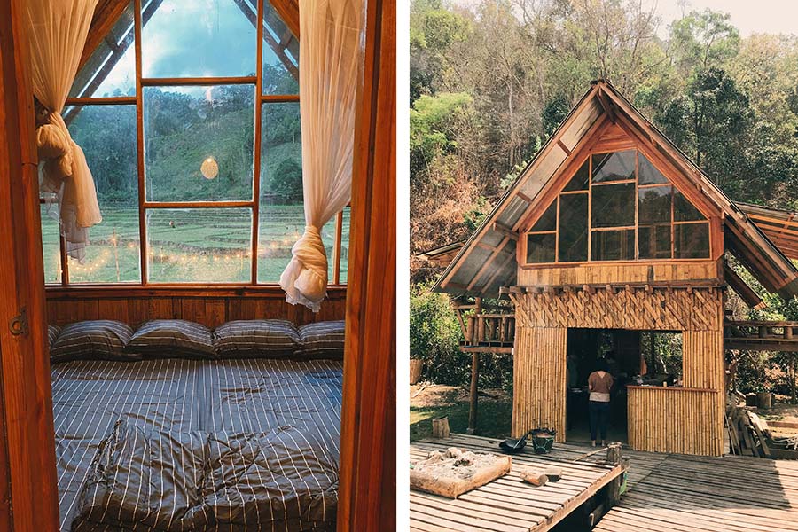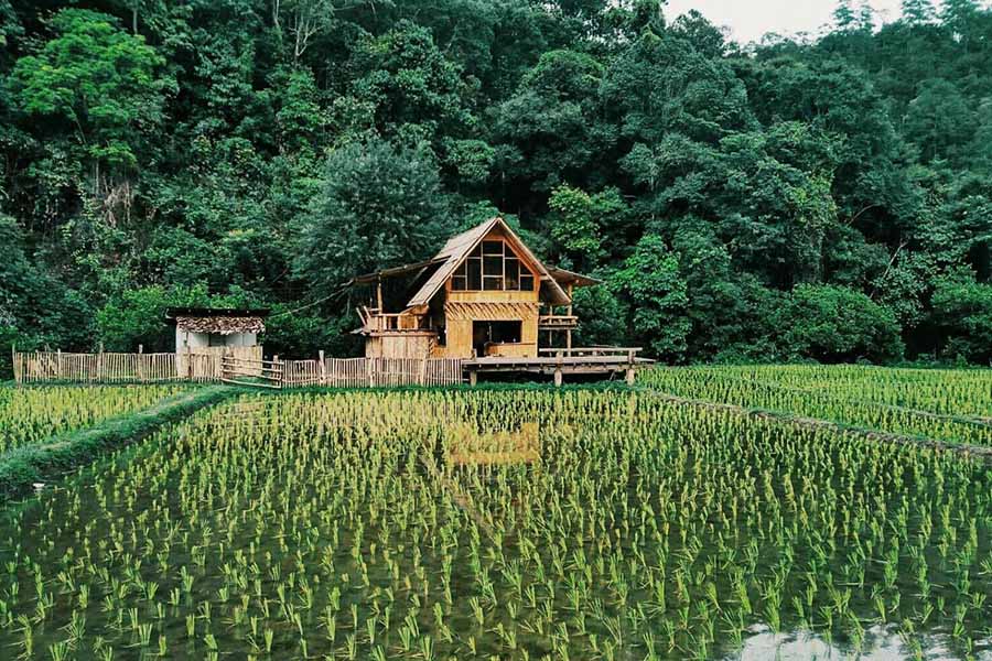 กระท่อมกลางนา ใช้ชีวิตช้าๆ ท่ามกลางธรรมชาติ ที่พักเป็นกระท่อมไม้ไผ่สองชั้น หลังตัวบ้านมีลำธารเล็กๆ ไหลผ่าน บริเวณรอบบ้านรายล้อมด้วยทุ่งนาและวิวเขา ตัวบ้านมีอ่างแช่น้ำให้ฟีลลิ่งของ pool villa กลางนาเก๋ๆ นอกจากนี้ยังมีเปลไว้ให้นอนอ่านหนังสือชมบรรยากาศวิวภูเขาและท้องนา อีกทั้งที่พักยังมีกิจกรรมต่างๆ ไม่ว่าจะเป็น พาทัวร์หมู่บ้านปกาเกอะญอ พาไปดูทะเลหมอกที่จุดชมวิว และดริปกาแฟในยามเช้า สำหรับบ้านพักมีเพียง 1 หลังเท่านั้น สามารถรองรับผู้เข้าพักได้ 8 – 10 คน แบ่งเป็น 2 ห้องนอน ที่สามารถชมวิวได้ต่างกัน คือวิวนาข้าวและวิวลำธาร ยามค่ำคืนยังได้เพลินเพลินไปกับกิจกรรมรอบกองไฟ พร้อมจิบเครื่องดื่มเด็ดๆ จากที่พักไว้คลายหนาวได้เป็นอย่างดี