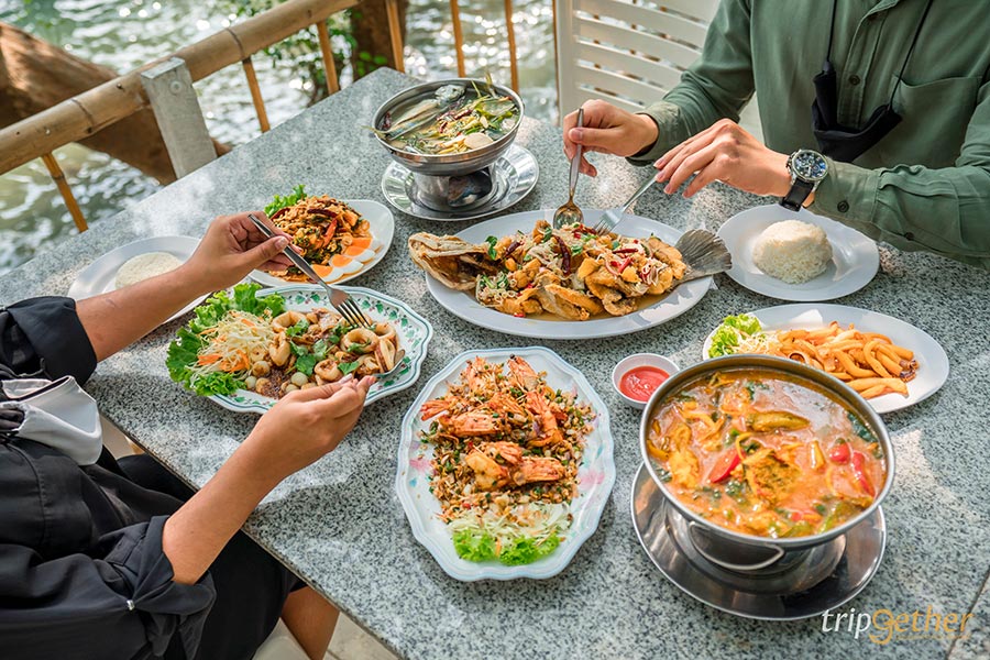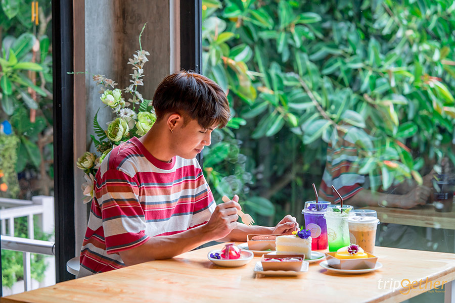 ที่ร้านมีโซนให้เลือกนั่งมากมายไม่ว่าจะอินดอร์แอร์เย็นๆ นั่งกินข้าวมองวิวผ่านกระจกบานใหญ่ หรือใครจะนั่งโซนเอาท์ดอร์บรรยากาศท่ามกลางสวน ติดริมน้ำก็สามารถเลือกได้ตามสะดวก สำหรับเมนูอาหารทางร้านมีให้เลือกแบบจัดเต็มทั้งอาหารคาว ของหวาน และเครื่องดื่ม มื้อแรกของเราในวันนี้อิ่มท้องพร้อมเดินทางต่อแน่นอน