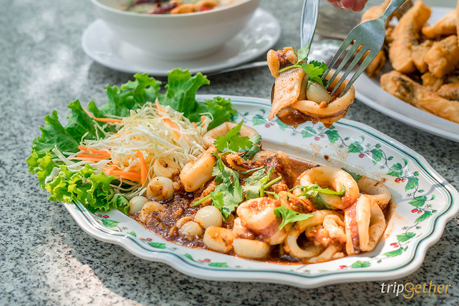 ปลาหมึกผัดกะปิกระเทียมโทน เนื้อปลาหมึกสด เด้ง อร่อยมาก