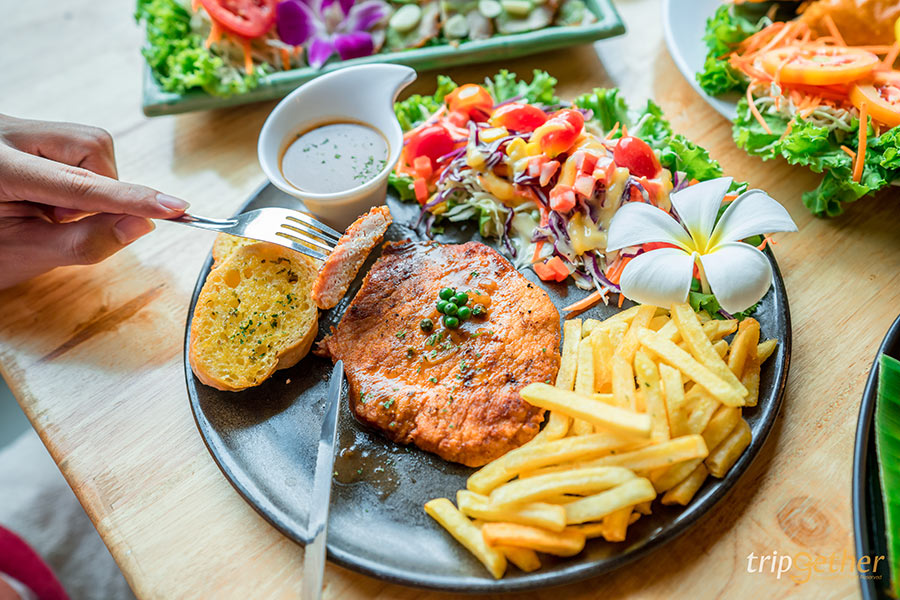 สเต็กหมูเนื้อนุ่มเสิร์ฟมาคู่กับเฟรนช์ฟรายส์ สลัด และขนมปังกระเทียม อิ่มจุกๆ