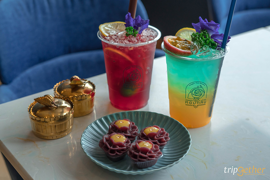 เริ่มต้นช่วงสายๆ ของวันเดย์ทริปอยุธยากันที่ร้าน หอมกลิ่น Thai dessert คาเฟ่ขนมไทยสุดชิคใจกลางเมืองอยุธยาที่มีขนมไทยโบราณมากมาย และสำหรับใครที่ยังไม่ได้กินอาหารเช้ามา ทางร้านก็มีเมนูอาหารไทยให้เลือกสั่งกันด้วย รับรองว่ามาเช็คอินที่นี่ไม่ผิดหวังอย่างแน่นอน เพราะตัวร้านตกแต่งด้วยสไตล์โมเดิร์นใช้โทนสีน้ำเงินตัดกับสีทองให้ความรู้สึกที่หรูหราและยังคงคอนเซ็ปต์เสน่ห์ไทยได้อย่างสวยงาม เป็นแนวร่วมสมัยที่ลงตัวสุดๆ