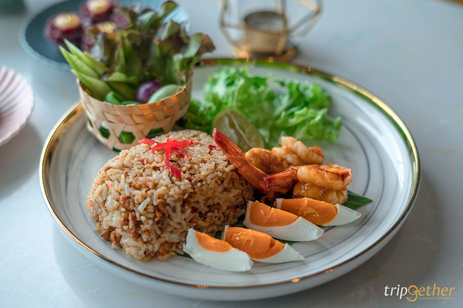 เมนูแนะนำที่มาแล้วต้องสั่งก็คือ ข้าวผัดน้ำพริกลงเรือ เสิร์ฟมาแล้วเครื่องแบบจัดเต็มทั้งกุ้งหวาน ไข่เค็ม ผัดสดและผัดลวก กินกับข้าวที่คลุกก้นกระทะบอกเลยว่าฟินมากกกกกจ้า
