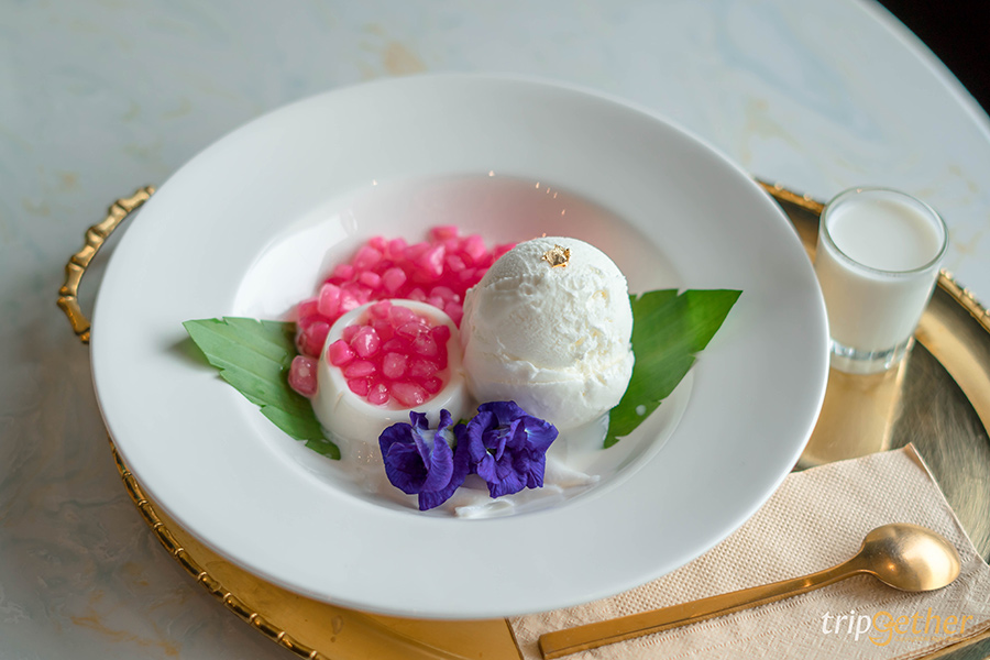 อีกหนึ่งเมนูที่แนะนำคือไอศกรีมกะทิเต้าฮวยมะพร้าวอ่อนทับทิมกรอบ
