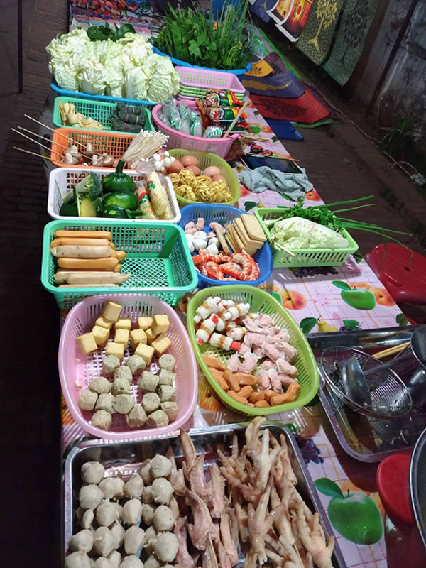 ตอนนี้จะ5ทุ่มแล้วเลยหาอะไรทานจะได้กลับไปพักผ่อนเพราะทั้งเดินทางกะเดินหาที่พักเล่นซะพลังงานแทบหมด เดินมาเจอสุกี้ลาว เขาขายเป็นชิ้นละ อยากทานอะไรก็คีบๆใส่เลยครับเดี๋ยวเขาเอาไปปรุงให้ทีหลัง ผมคีบไปเกือบ 30,000 กีบ (ประมาณ120บาท) สงสัยเพราะความหิว