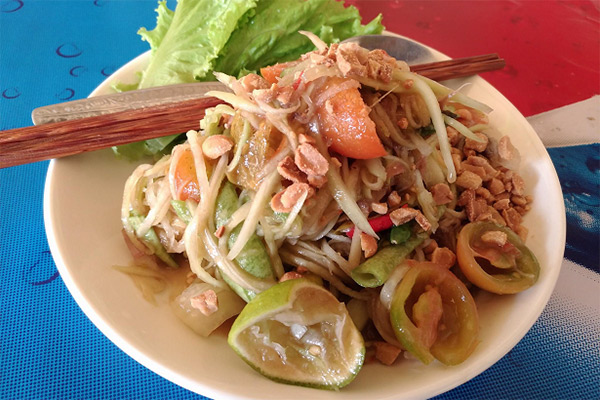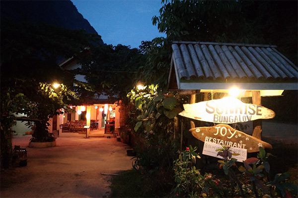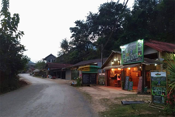 ตอนนั้นสั่งข้าวผัดไข่ ส้มตำ แล้วก็กาแฟเย็นไป ตั้งแต่ทานอาหารของ สปป.ลาวมาหลายที่มีที่นี่แหละครับที่รสชาติเหมือนทานในไทย โดยเฉพาะส้มตำ เลยฝากท้องไว้ที่นี่เกือบทุกมื้อ หลังจากกินเสร็จก็กลับมานอนเล่นที่เปลที่พักกะให้อาหารย่อยสักหน่อย ปรากฎว่าเผลอหลับครับ ตกใจตื่นมาอีกที 4 โมงเย็น คือที่นี่มืดเร็วมากเพราะภูเขาบังพระอาทิตย์ ตอนแรกนึกว่าหกโมงเย็นเสียอีก เลยรีบออกมาเดินเล่น
