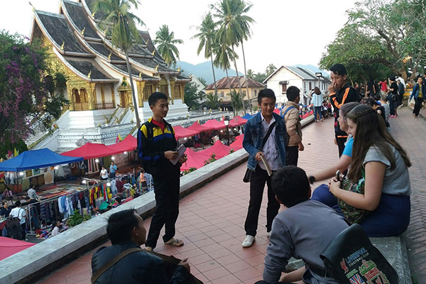 ไม่แปลกใจเลยครับว่าทำไมเด็กนักเรียนที่หลวงพระบางถึงสือสารภาษาอังกฤษกันได้ ตอนแรกคนที่นั่งหันหลัง(ล่างซ้าย)จะเป็นคนเข้ามาถามชาวต่างชาติก่อนเพื่อมาขอเรียนรู้ภาษาแล้วจึงให้เด็กคนที่พูดด้วยเข้ามาคุยกับชาวต่างชาติ คุยกันทีละคนไม่ได้แย่งกันพูดจบจากคนนี้ก็ไปหาคนใหม่ และผมก็ได้มีโอกาสคุยกับชาวหลวงพระบางเขาบอกว่าเดี๋ยวนี้เขานิยมส่งลูกไปเรียนที่จีนมากขึ้นเพราะที่หลวงพระบางมีนักท่องเที่ยวจีนเพิ่มมากขึ้น