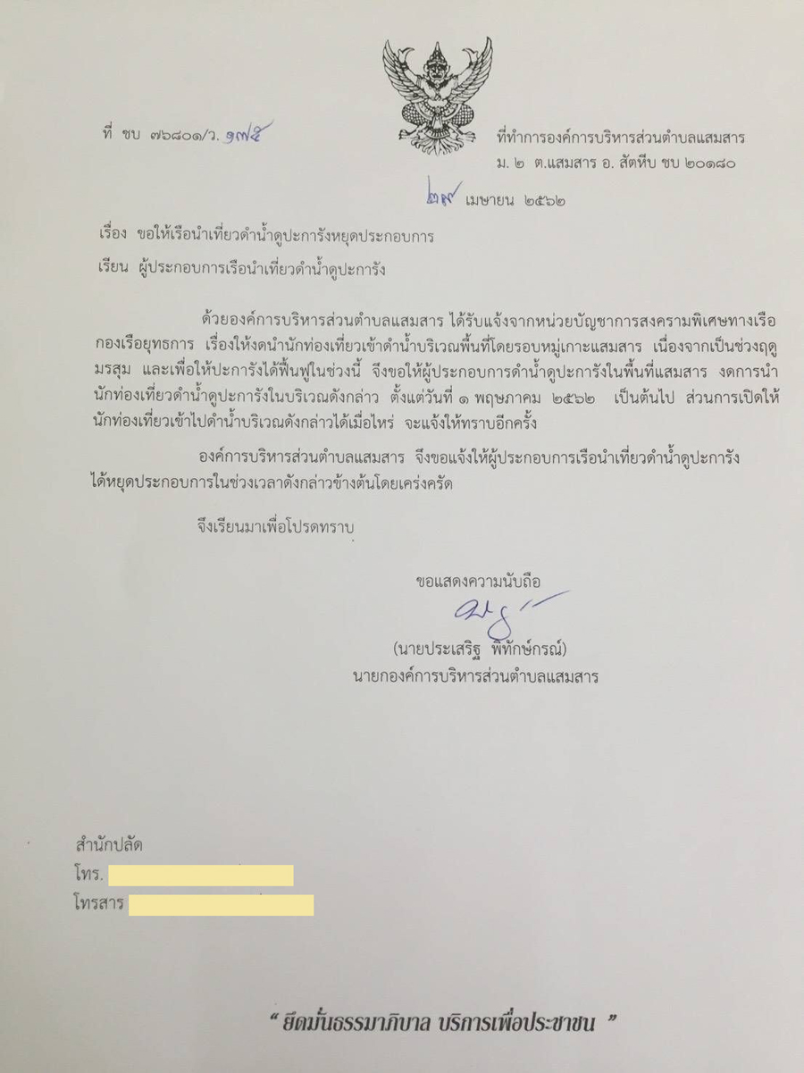 ซึ่งอยู่ภายใต้การดูแลของหน่วยบัญชาการสงครามพิเศษทางเรือกองยุทธการ ได้ประกาศให้งดนำนักท่องเที่ยวเข้าดำน้ำพื้นที่โดยรอบหมู่เกาะแสมสาร (อ่าวแสมสาร ซึ่งประกอบไปด้วยหมู่เกาะต่างๆ) เนื่องด้วยเป็นช่วงฤดูมรสุมและเพื่อฟื้นฟูปะการัง ตั้งแต่วันที่ 1 พฤษภาคม 2562 เป็นต้นไป ส่วนการเปิดให้นักท่องเที่ยวเข้าไปดำน้ำบริเวณดังกล่าวจะแจ้งให้ทราบอีกครั้ง **ทั้งนี้เกาะแสมสารและเกาะขาม ซึ่งอยู่ภายใต้การดูแลของกองทัพเรือ นักท่องเที่ยวยังสามารถไปเที่ยวได้ปกติ