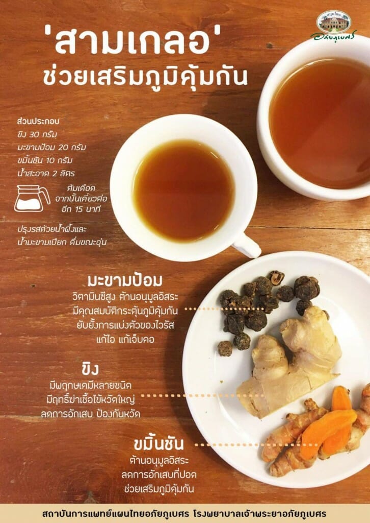 ขอบคุณข้อมูลจาก: หนังสืออาหารสมุนไพรเสริมภูมิคุ้มกันในช่วงที่มีการระบาดของโควิด-19 กลุ่มงานเภสัชกรรมและกลุ่มงานการแพทย์แผนไทยและการแพทย์ทางเลือ โรงพยาบาลเจ้าพระยาอภัยภูเบศร