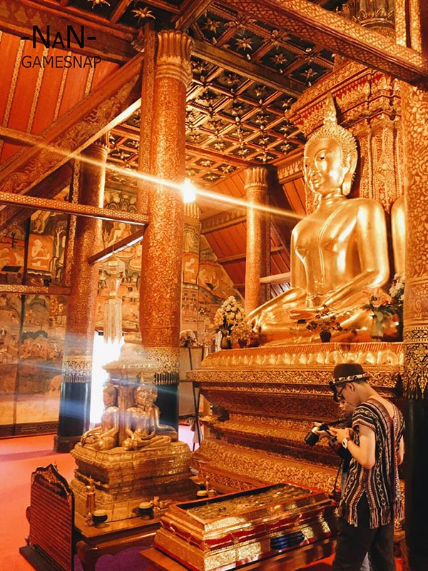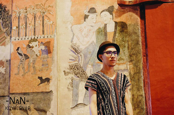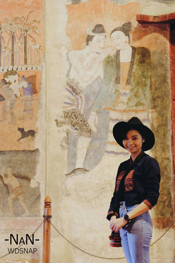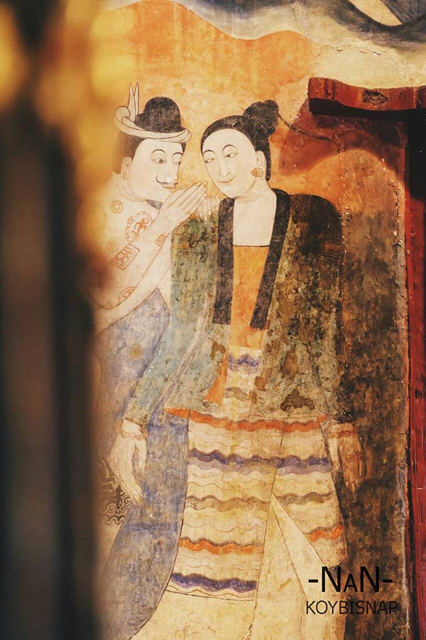 วัดภูมินทร์ ใครที่มาเมืองน่านจะพลาดวัดภูมินทร์ไม่ได้ครับ ด้วยจิตรกรรมฝาผนังของทางล้านนาที่ขึ้นชื่อ “ ปู่ม่าน ย่าม่าน” หรือกระซิบรักบรรลือโลก ครับ ผู้ชายสมัยก่อนจะนิยมสักยันต์ดังที่เห็นในภาพครับ และยังมีภาพอื่นๆที่แสดงให้เห็นถึงวิถีชีวิต ศิลปวัฒนธรรมของชาวล้านนาในอดีต นอกจากนี้ยังมีพระพุทธรูปขนาดใหญ่ 4 องค์หันหน้าออก