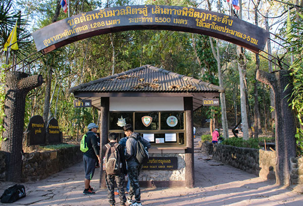 6 โมงกว่าๆก็เริ่มมีรถสองแถวสีแดงมาจอดรอ 10 คนก็ออกรถ หรือหารกันไม่รอก็ได้ค่ะ ตอนนั้นก็หารกันสี่ห้าคน คนละ 40 บาท ถึงอุทยานแห่งชาติภูกระดึงแล้ว สู้โว๊ยยย