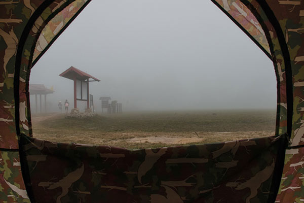 เดินตามกันมาเป็นแถว ระหว่างทางก็มีจุดขายอาหาร เครื่องดื่มค่ะ ข้าวจี่ เป็นอาหารที่ขึ้นชื่อของภูกระดึงอีกอย่างค่ะ ได้แค่คนล่ะไม้ เพราะเดี๋ยวถึงที่พักก็จะทานข้าวแล้ว กัสท์จังอยากจะเดินกลับไปซื้ออีก ติดใจความอร่อย… เก็บกล้อง… ตั้งใจเดิน… มะนาวเดินไม่ไหวบอกตรงๆ ขามันหมดแรง ต้องขอให้ช่างภาพพี่เลี้ยงจูงมือ เราเดินแข่งกับความมืด ความกลัวจะหลุดห่างจากกลุ่ม เดินไวมาก กัสท์จัง ยังร่าเริ่ง โดดไป ร้องเพลงไป น่าจะเพราะอยากจะหาอะไรทำสนุกๆ 9 กิโลเมตรนี้ เราเดินกลับมาถึงเต็นท์ไม่ถึง 3 ช.ม มะนาวเดินเลยเต็นท์ไปนั่งที่ศาลาถอดรองเท้าทิ้ง เพราะมีแต่ทรายในรองเท้า เดินเหยียบทรายมาตั้งหลายก.ม พอหายเหนื่อย จะลุกขึ้นเดินไปหากัสท์จังที่เต็นท์ ก็ถึงกับร้องไห้เลย เจ็บปวดทุกก้าว ค่อยๆลากขาไป อาจจะเพราะเราหยุดเดิน กล้ามเนื้อไม่ทันตั้งตัวแน่ๆ คืนนี้คงไปโดนตะคริวกินขาในห้องน้ำไม่ไหวล่ะ เช็ดตัวแบบกัสท์จังพอดีกว่า หลังจากเรียบร้อยเราก็ลากสังขาร ไปหาข้าวกิน กัสท์จังอยู่ๆเป็นแบบมะนาว เดินไม่ได้เลย ขาตึง ต้องประคองกันไปร้านอาหาร คืนนั้น มะนาวไม่เจริญอาหารเลย มันเหนื่อยเกินไป กัสท์จังร้องไห้แง้ๆ ปวดขา ต้องนวดกันไป ขำกันไป สลับร้องไห้ เป็นคืนที่ โคตรทรมาน ถามตัวเองว่า บ้ารึเปล่า มาทำอะไรที่ภูกระดึง ได้ยินเสียงคนคุยกันคึกคักรอบๆ เลยลุกขึ้นมาเปิดหน้าต่าง โอ้ววว วันนี้มีหมอกด้วย