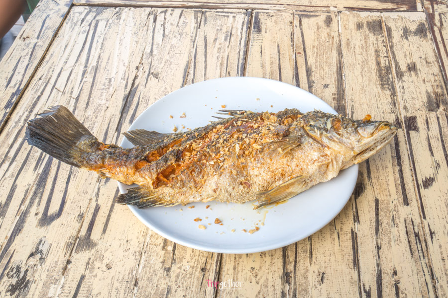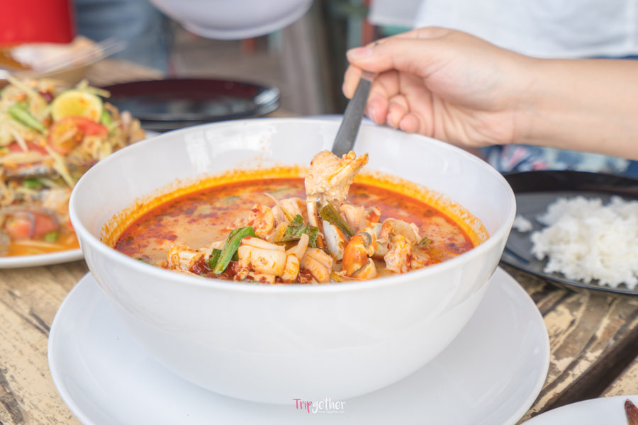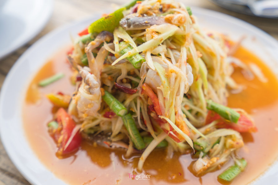 เวลาเช็คอินที่พักคือตั้งแต่บ่ายโมงเป็นต้นไป ซึ่งก่อนจะมาถึงที่พักแนะนำว่าไม่ต้องกินอะไรเข้ามา เพราะทางที่พักจะมีอาหารกลางวันไว้ให้บริการโดยมีเมนูส้มตำปูม้า ผัดผักรวมมิตร ซีฟู้ดต้มยำน้ำข้น ปลากระบอกทอดกร๊อบกรอบ ซึ่งแต่ละเมนูเด็ดมากๆ เติมได้ไม่อั้นอีกด้วยค่ะ