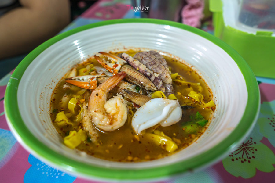 ซึ่งมื้อนี้เราขอตามรีวิวไปกินเมนูก๋วยเตี๋ยวกั้ง ก๋วยเตี๋ยวซีฟู้ดที่ร้านป้าอี๊ด ซึ่งรอคิวนานใช้ได้เลย โดยเมนูแนะนำที่เราสั่งมารับประทานเป็นเมนูบะหมี่ต้มยำซีฟู้รวม และข้าวหน้าซีฟู้ดรวม จานละ 70 บาท
